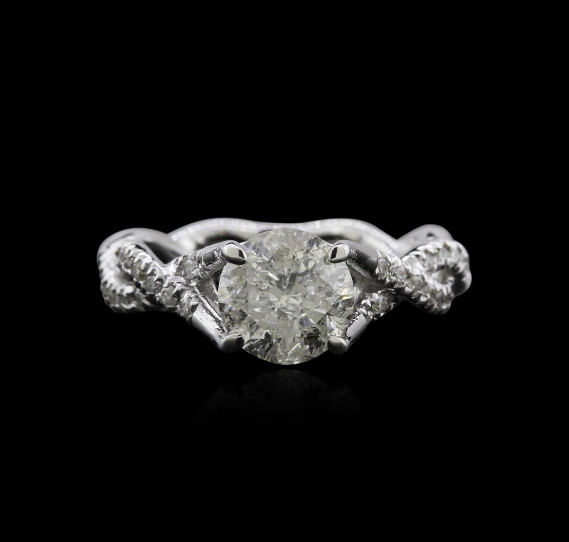 One electronically tested 14KT white gold ladies cast diamond engagement ring with a bright polish finish. Identified with markings of "14K". Condition is very good. Containing: One prong set round brilliant cut diamond, measuring 7.50 - 7.40 x 5.08mm (depth est.) approximate weight of 1.72ct. Clarity: I-3. Color: J, Cut is Good. Twenty-Eight prong set round brilliant cut diamonds, measuring 1.10 - 1.10 x 0.66mm (depth est.) approximate. Total Weight of 28 Stones = 0.13ct. Clarity: I-1 to I-2. Color: I - J, Cut is Very Good. All diamonds are graded in the mounting, unless otherwise stated. Total Weight of Diamonds 1.85ct. Total Weight of Engagement Ring 4.80 grams. GGL Appraised at $5,880.00.