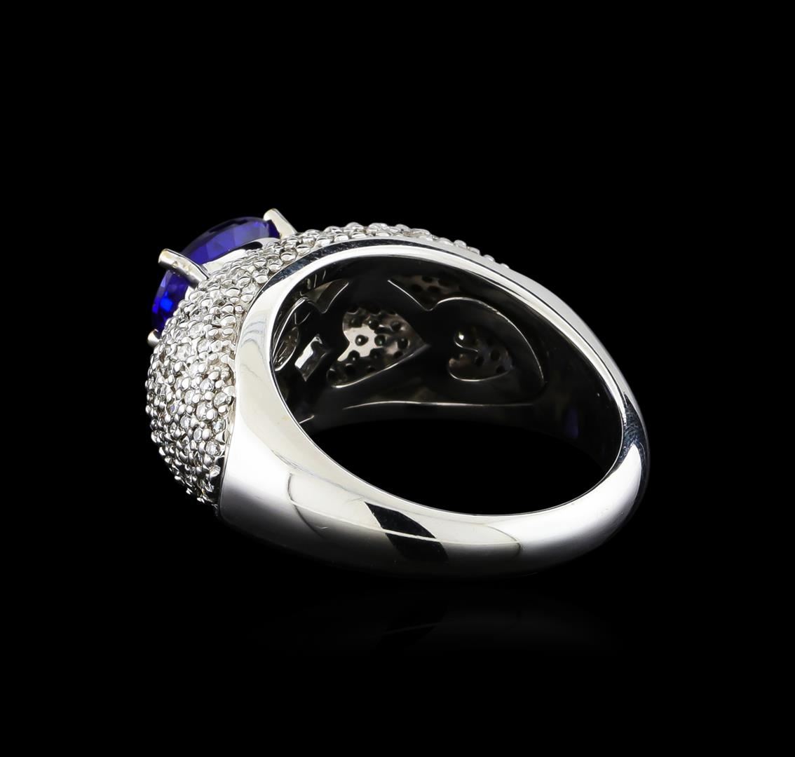 One electronically tested 14KT white gold ladies combination cast & assembled tanzanite and diamond ring with a flat shank with rounded edges with a bright polish finish. Identified with markings of "14K". Condition is new. Containing: One prong set oval modified brilliant cut natural tanzanite, measuring 8.83 x 6.87 x 4.47mm, approximate weight of 1.85ct., clarity is eye clean, type I, medium, moderately strong, bluish violet color, (GIA bV 5/4), cut is very good. One Hundred Eighty pave' set round brilliant cut diamonds, measuring 1.10 - 1.10 x 0.66mm (depth est.) approximate total weight of 180 Stones = 0.86ct. Clarity: SI-2 to I-1. Color: I - J, Cut is Good. Colored gemstones are presumed to have been subjected to commonly used enhancement processes. All diamonds and colored gemstones are graded in the mounting, unless otherwise stated. Total Weight of Colored Stones 1.85ct. Total Weight of Diamonds 0.86ct. Total Weight of Ring 11.20 grams. GGL Appraised at $9,925.00.