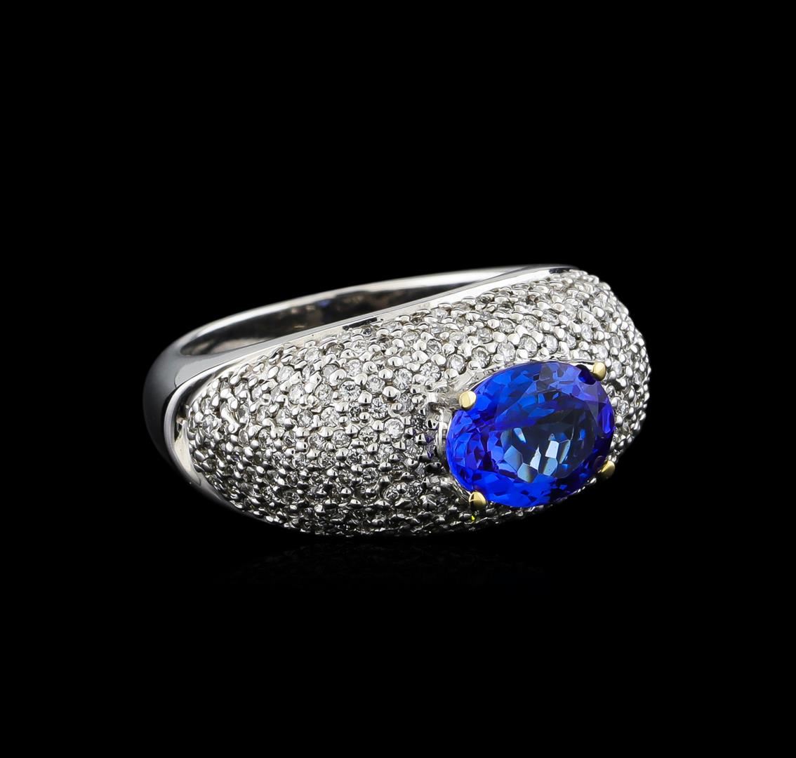 One electronically tested 14KT white gold ladies combination cast & assembled tanzanite and diamond ring with a flat shank with rounded edges with a bright polish finish. Identified with markings of "14K". Condition is new. Containing: One prong set oval modified brilliant cut natural tanzanite, measuring 8.83 x 6.87 x 4.47mm, approximate weight of 1.85ct., clarity is eye clean, type I, medium, moderately strong, bluish violet color, (GIA bV 5/4), cut is very good. One Hundred Eighty pave' set round brilliant cut diamonds, measuring 1.10 - 1.10 x 0.66mm (depth est.) approximate total weight of 180 Stones = 0.86ct. Clarity: SI-2 to I-1. Color: I - J, Cut is Good. Colored gemstones are presumed to have been subjected to commonly used enhancement processes. All diamonds and colored gemstones are graded in the mounting, unless otherwise stated. Total Weight of Colored Stones 1.85ct. Total Weight of Diamonds 0.86ct. Total Weight of Ring 11.20 grams. GGL Appraised at $9,925.00.