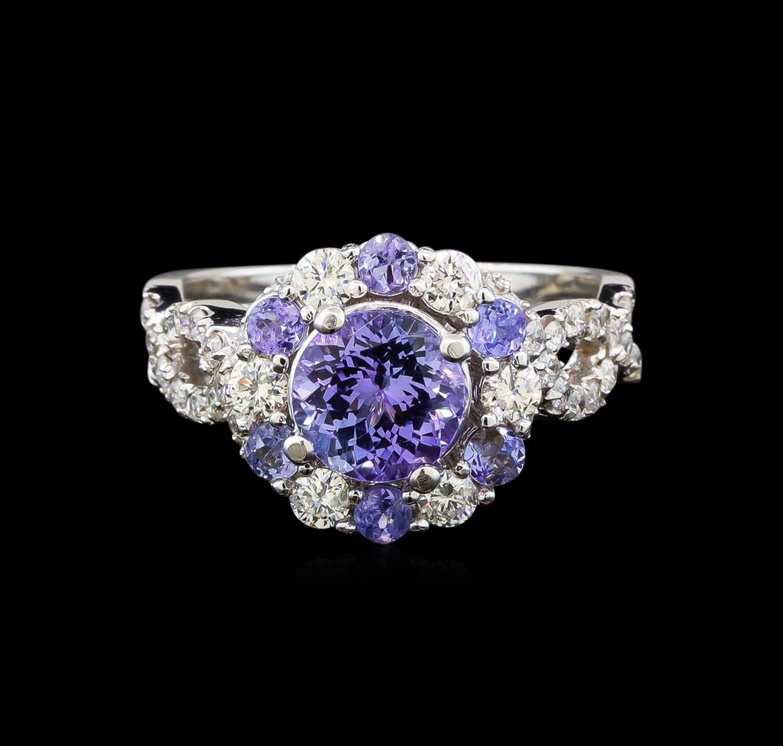 One electronically tested 14KT white gold ladies cast tanzanite and diamond ring with a bright polish finish. Identified with markings of "14K". Condition is new. Containing: One prong set round modified brilliant cut natural tanzanite, measuring 6.90 - 6.90 x 4.49 mm, approximate weight of 1.43ct., clarity is eye clean, type I, light, very slightly grayish, violet color, (GIA V 3/3), cut is good. Six prong set round modified brilliant cut natural tanzanites, measuring 2.50 - 2.50 x 1.63 mm, approximate total weight of 0.42ct., clarity is eye clean, type I, light, very slightly grayish, violet color, (GIA V 3/3), cut is good. Six prong set round brilliant cut diamonds, measuring 2.40 - 2.40 x 1.44mm (depth est.) approximate total weight of 6 Stones = 0.30ct. Clarity: SI-1 to SI-2. Color: I - J, Cut is Good. Thirty-Eight prong set round brilliant cut diamonds, measuring 1.50 - 1.50 x 0.90mm (depth est.) approximate total weight of 38 Stones = 0.47ct. Clarity: SI-1 to SI-2. Color: I - J, Cut is Good. Colored gemstones are presumed to have been subjected to commonly used enhancement processes. All diamonds and colored gemstones are graded in the mounting, unless otherwise stated. Total Weight of Colored Stones 1.85ct. Total Weight of Diamonds 0.77ct. Total Weight of Ring 5.30 grams. GGL Appraised at $3,695.00.