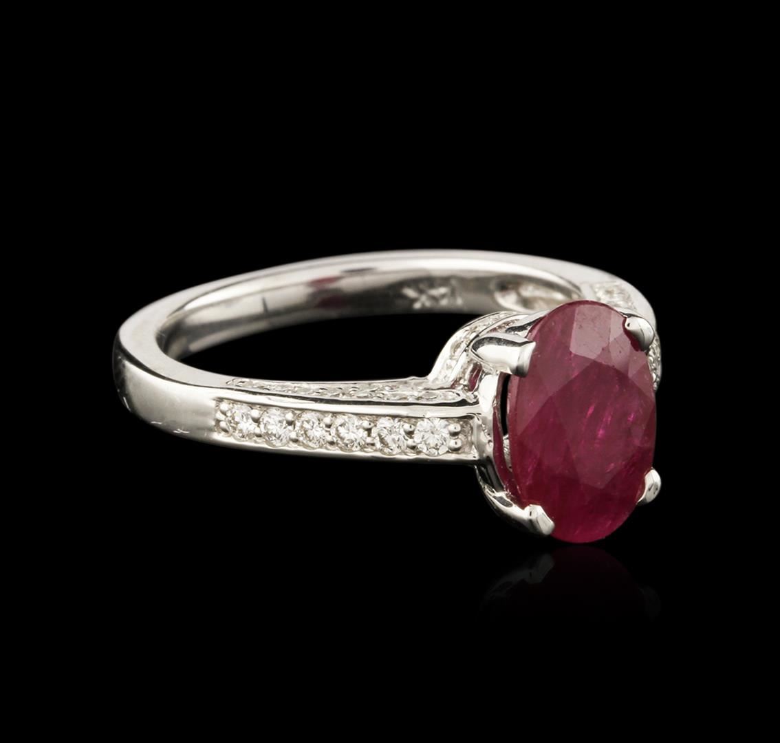 One electronically tested 14KT white gold ladies cast ruby and diamond ring with a bright polish finish. Identified with markings of "14K". Condition is new. Containing: One prong set oval modified brilliant cut natural ruby, measuring 9.70 x 7.00 x 3.20mm, approximate weight of 1.85ct., clarity is heavily included, medium, moderately strong, strongly purplish red color, (GIA stpR 5/4), cut is good. Eighty prong set round brilliant cut diamonds, measuring 1.50 - 1.30 x 0.84mm (depth est.) approximate total weight of 80 Stones = 0.80ct. Clarity: SI-1 to SI-2. Color: I - J, Cut is Good. Colored gemstones are presumed to have been subjected to commonly used enhancement processes. All diamonds and colored gemstones are graded in the mounting, unless otherwise stated. Total Weight of Colored Stones 1.85ct. Total Weight of Diamonds 0.80ct. Total Weight of Ring 4.50 grams. GGL Appraised at $3,015.00.