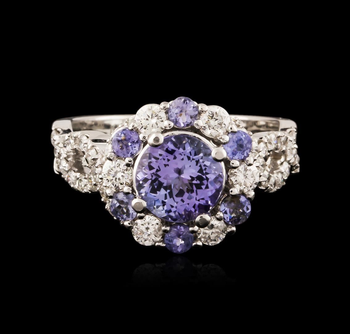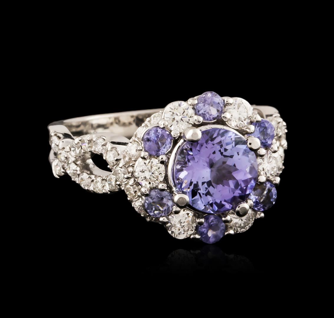 One electronically tested 14KT white gold ladies cast tanzanite and diamond ring with a bright polish finish. Identified with markings of "14K". Condition is new. Containing: One prong set round modified brilliant cut natural tanzanite, measuring 6.90 - 6.90 x 4.49 mm, approximate weight of 1.43ct., clarity is eye clean, type I, light, very slightly grayish, violet color, (GIA V 3/3), cut is good. Six prong set round modified brilliant cut natural tanzanites, measuring 2.50 - 2.50 x 1.63 mm, approximate total weight of 0.42ct., clarity is eye clean, type I, light, very slightly grayish, violet color, (GIA V 3/3), cut is good. Six prong set round brilliant cut diamonds, measuring 2.40 - 2.40 x 1.44mm (depth est.) approximate total weight of 6 Stones = 0.30ct. Clarity: SI-1 to SI-2. Color: I - J, Cut is Good. Thirty-Eight prong set round brilliant cut diamonds, measuring 1.50 - 1.50 x 0.90mm (depth est.) approximate total weight of 38 Stones = 0.47ct. Clarity: SI-1 to SI-2. Color: I - J, Cut is Good. Colored gemstones are presumed to have been subjected to commonly used enhancement processes. All diamonds and colored gemstones are graded in the mounting, unless otherwise stated. Total Weight of Colored Stones 1.85ct. Total Weight of Diamonds 0.77ct. Total Weight of Ring 5.30 grams. GGL Appraised at $3,695.00.