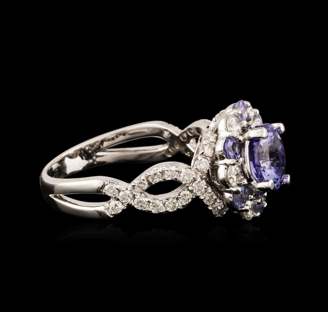 One electronically tested 14KT white gold ladies cast tanzanite and diamond ring with a bright polish finish. Identified with markings of "14K". Condition is new. Containing: One prong set round modified brilliant cut natural tanzanite, measuring 6.90 - 6.90 x 4.49 mm, approximate weight of 1.43ct., clarity is eye clean, type I, light, very slightly grayish, violet color, (GIA V 3/3), cut is good. Six prong set round modified brilliant cut natural tanzanites, measuring 2.50 - 2.50 x 1.63 mm, approximate total weight of 0.42ct., clarity is eye clean, type I, light, very slightly grayish, violet color, (GIA V 3/3), cut is good. Six prong set round brilliant cut diamonds, measuring 2.40 - 2.40 x 1.44mm (depth est.) approximate total weight of 6 Stones = 0.30ct. Clarity: SI-1 to SI-2. Color: I - J, Cut is Good. Thirty-Eight prong set round brilliant cut diamonds, measuring 1.50 - 1.50 x 0.90mm (depth est.) approximate total weight of 38 Stones = 0.47ct. Clarity: SI-1 to SI-2. Color: I - J, Cut is Good. Colored gemstones are presumed to have been subjected to commonly used enhancement processes. All diamonds and colored gemstones are graded in the mounting, unless otherwise stated. Total Weight of Colored Stones 1.85ct. Total Weight of Diamonds 0.77ct. Total Weight of Ring 5.30 grams. GGL Appraised at $3,695.00.