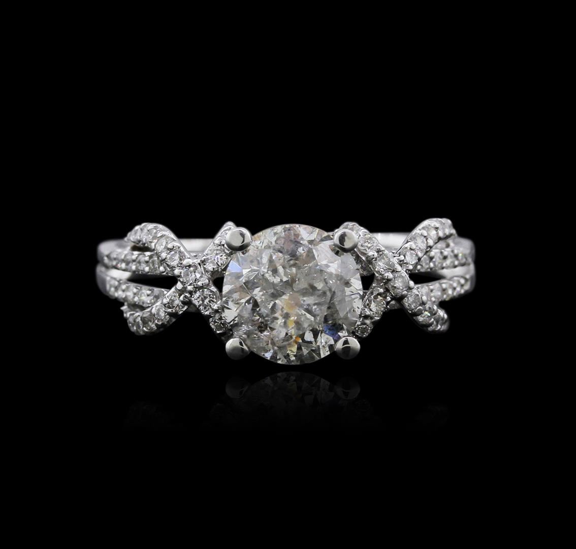 One electronically tested 14KT white gold ladies cast diamond engagement ring with a bright polish finish. Condition is very good. Containing: One prong set round brilliant cut diamond, measuring 7.20 - 7.20 x 4.77mm (depth est.) approximate weight of 1.51ct. Clarity: I-3. Color: J, Cut is Good. Fifty-Six prong set round brilliant cut diamonds, measuring 1.20 - 1.20 x 0.72mm (depth est.) approximate. Total Weight of 56 Stones = 0.35ct. Clarity: SI-2 to I-2. Color: I - J, Cut is Good. All diamonds are graded in the mounting, unless otherwise stated. Total Weight of Diamonds 1.86ct. Total Weight of Engagement Ring 3.70 grams. GGL Appraised at $5,170.00.