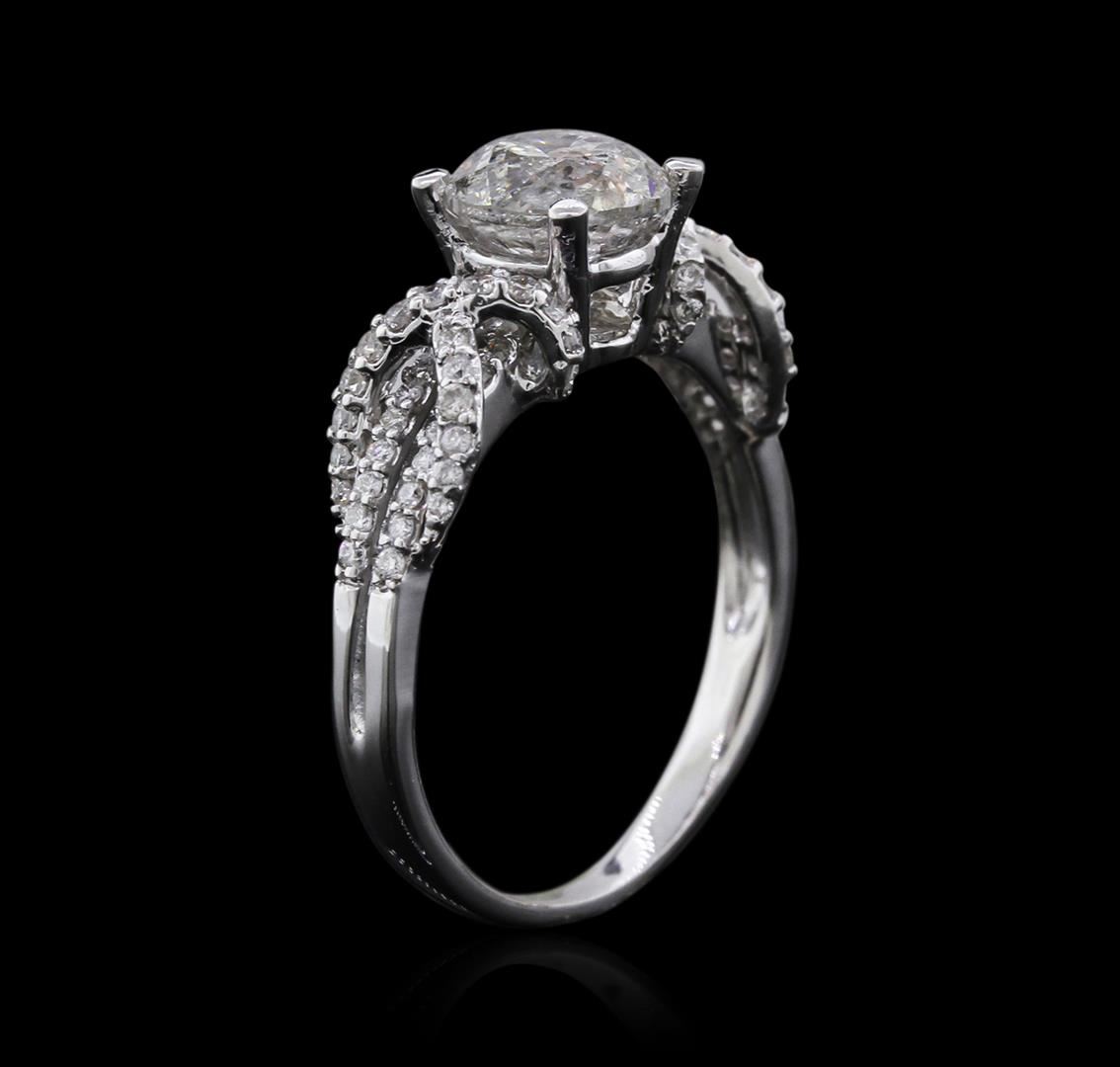 One electronically tested 14KT white gold ladies cast diamond engagement ring with a bright polish finish. Condition is very good. Containing: One prong set round brilliant cut diamond, measuring 7.20 - 7.20 x 4.77mm (depth est.) approximate weight of 1.51ct. Clarity: I-3. Color: J, Cut is Good. Fifty-Six prong set round brilliant cut diamonds, measuring 1.20 - 1.20 x 0.72mm (depth est.) approximate. Total Weight of 56 Stones = 0.35ct. Clarity: SI-2 to I-2. Color: I - J, Cut is Good. All diamonds are graded in the mounting, unless otherwise stated. Total Weight of Diamonds 1.86ct. Total Weight of Engagement Ring 3.70 grams. GGL Appraised at $5,170.00.