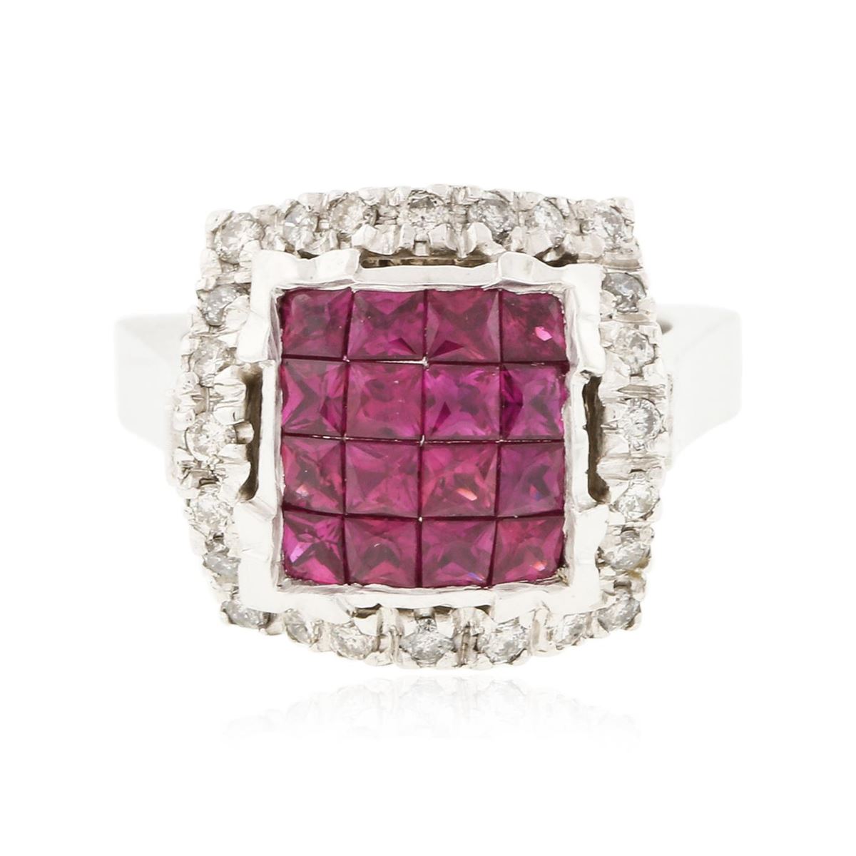 One electronically tested 14KT white gold ladies cast ruby and diamond ring with a bright polish finish. Condition is good. The featured ruby cluster is set within an elaborate diamond lattice gallery, completed by a four millimeter wide band. Identified with markings of "14K". Containing: Sixteen invisible set square brilliant cut natural rubies, measuring 2.60 x 2.50 x 1.66mm, approximate total weight of 1.86ct., clarity is slightly included, type II, medium dark, moderately strong, slightly purplish red color, (GIA slpR 6/4), cut is good. Transmitting light with a minimum of distortion, transparent. Naturally occurring internal & external characteristics are present. Measurements & the color grade are an average for the group. Graded in the setting. Ruby has a low tolerance to rhodium plating, repolishing the surface, & ultrasonic cleaning. Twenty-four prong set round brilliant cut diamonds, measuring 1.80 - 1.70 x 1.05mm (depth est.) approximate total weight of 24 Stones = 0.57ct. Faint brown secondary color throughout. Graded in the setting. Clarity SI-2 to I-2. Color I - K. Twenty-eight flush set round brilliant cut diamonds, measuring 1.30 - 1.20 x 0.75mm (depth est.) approximate total weight of 28 Stones = 0.28ct. Faint brown secondary color throughout. Graded in the setting. Clarity VS-2 to SI-2. Color I - K. Total Weight of Colored Stones 1.86ct. Total Weight of Diamonds 0.85ct. Total Weight of Ring 13.70gm. AIG Appraised at $6,670.00.