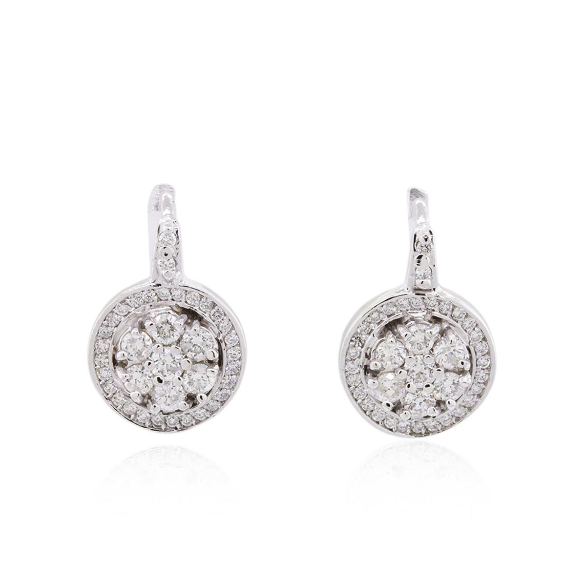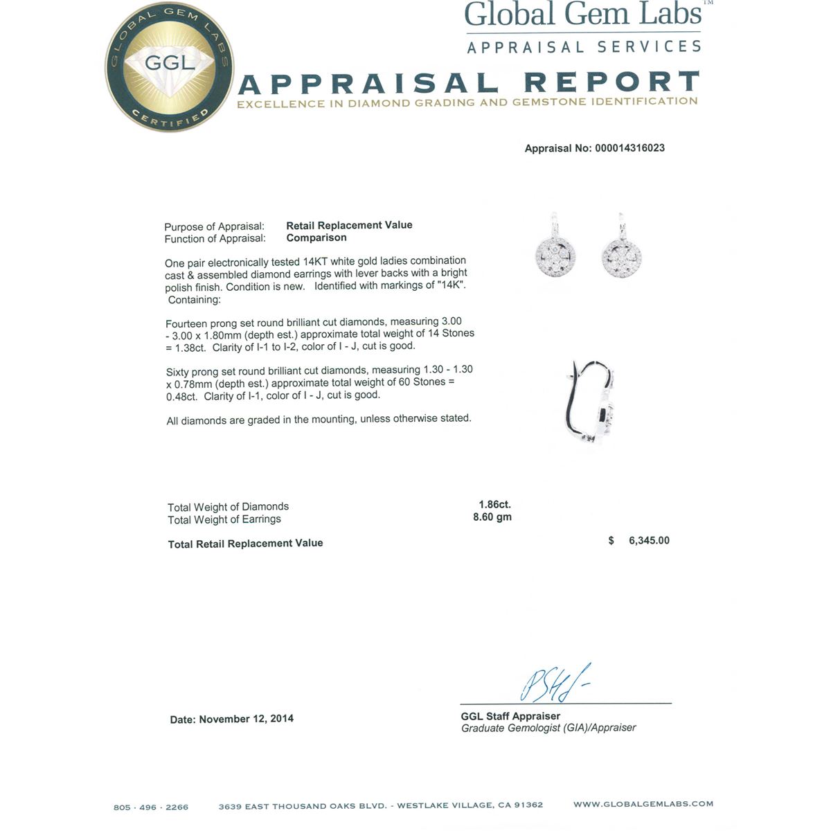 One pair electronically tested 14KT white gold ladies combination cast & assembled diamond earrings with lever backs with a bright polish finish. Identified with markings of "14K". Condition is new. Containing: Fourteen prong set round brilliant cut diamonds, measuring 3.00 - 3.00 x 1.80mm (depth est.) approximate total weight of 14 Stones = 1.38ct. Clarity: I-1 to I-2. Color: I - J, Cut is Good. Sixty prong set round brilliant cut diamonds, measuring 1.30 - 1.30 x 0.78mm (depth est.) approximate total weight of 60 Stones = 0.48ct. Clarity: I-1. Color: I - J, Cut is Good. All diamonds are graded in the mounting, unless otherwise stated. Total Weight of Diamonds 1.86ct. Total Weight of Earrings 8.60 grams. GGL Appraised at $6,345.00.