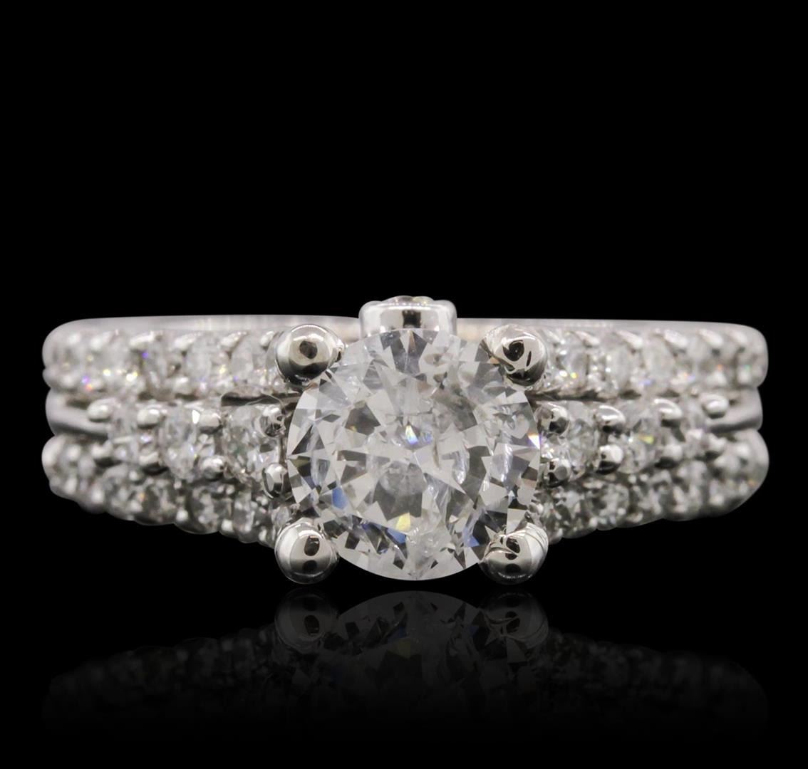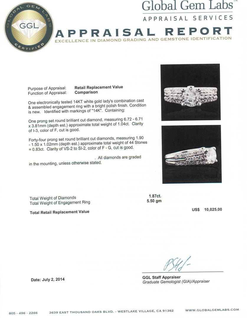 One electronically tested 14KT white gold Ladies combination cast & assembled engagement ring with a bright polish finish. Condition is new. Identified with markings of "14K". Containing: One prong set round brilliant cut diamond, measuring 6.72 - 6.71 x 3.81mm (depth est.) approximate. Total Weight of 1.04ct. Clarity: I-3. Color: F, Cut is Good. Forty-Four prong set round brilliant cut diamonds, measuring 1.90 - 1.50 x 1.02mm (depth est.) approximate. Total Weight of 44 Stones = 0.83ct. Clarity: VS-2 to SI-2. Color: F - G, Cut is Good. EGL USA GEM ID# US 911348427D. All diamonds are graded in the mounting, unless otherwise stated. Total Weight of Diamonds 1.87ct. Total Weight of Engagement Ring 5.50 grams. GGL Appraised.