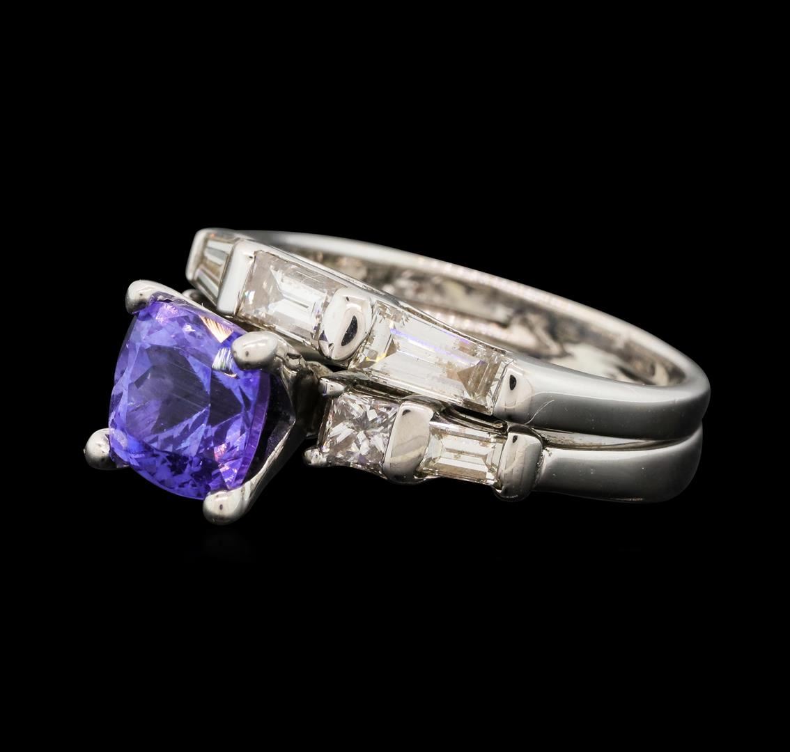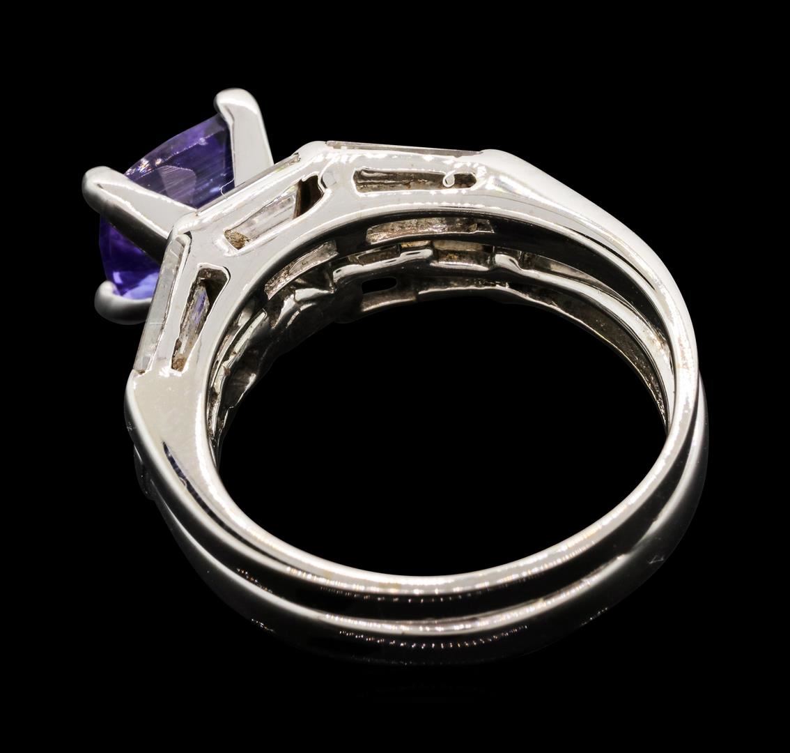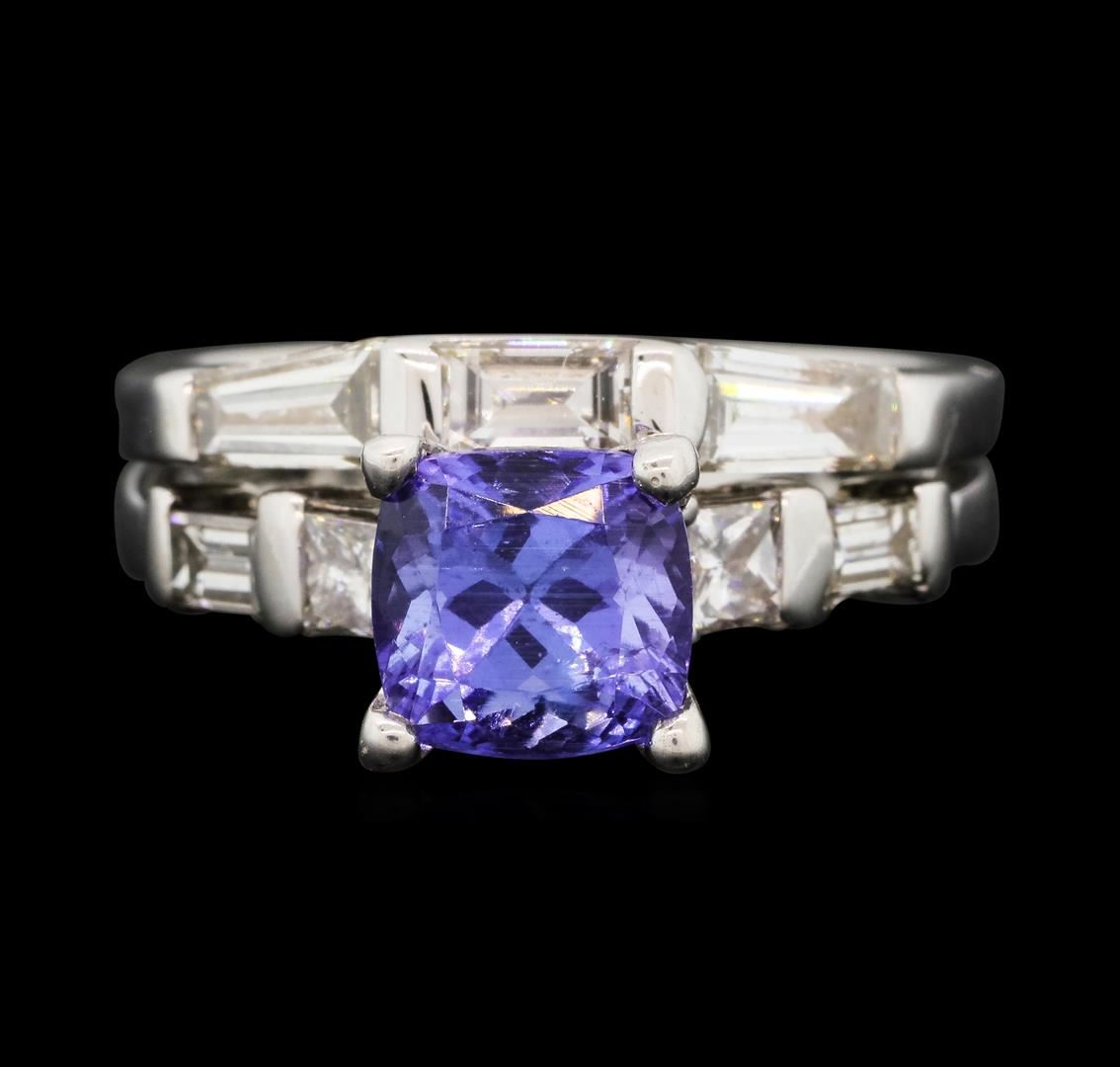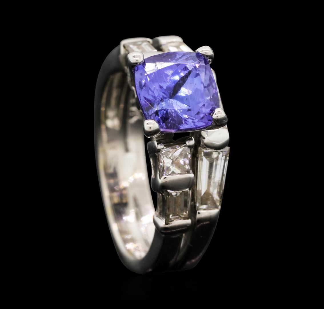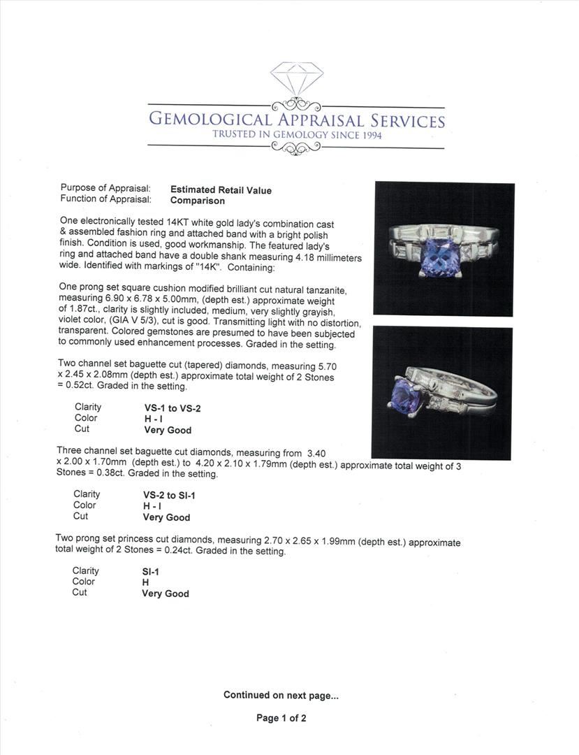 One electronically tested 14KT white gold lady's combination cast & assembled fashion ring and attached band with a bright polish finish. The featured lady's ring and attached band have a double shank measuring 4.18 millimeters wide. Identified with markings of "14K". Condition is used, good workmanship. Containing: One prong set square cushion modified brilliant cut natural tanzanite, measuring 6.90 x 6.78 x 5.00mm, (depth est.) approximate weight of 1.87ct., clarity is slightly included, medium, very slightly grayish, violet color, (GIA V 5/3), cut is good. Transmitting light with no distortion, transparent. Colored gemstones are presumed to have been subjected to commonly used enhancement processes. Graded in the setting. Two channel set baguette cut (tapered) diamonds, measuring 5.70 x 2.45 x 2.08mm (depth est.) approximate. Total Weight of 2 Stones = 0.52ct. Graded in the setting. Color H - I Clarity VS-1 to VS-2 Cut Very Good Three channel set baguette cut diamonds, measuring from 3.40 x 2.00 x 1.70mm (depth est.) to 4.20 x 2.10 x 1.79mm (depth est.) approximate. Total Weight of 3 Stones = 0.38ct. Graded in the setting. Color H - I Clarity VS-2 to SI-1 Cut Very Good Two prong set princess cut diamonds, measuring 2.70 x 2.65 x 1.99mm (depth est.) approximate. Total Weight of 2 Stones = 0.24ct. Graded in the setting. Color HClarity SI-1 Cut Very Good. Total Weight of Colored Stones 1.87ct.. Total Weight of Diamonds 1.14ct.. Total Weight of Ring And Attached Band 5.50gm. GAS Appraised.