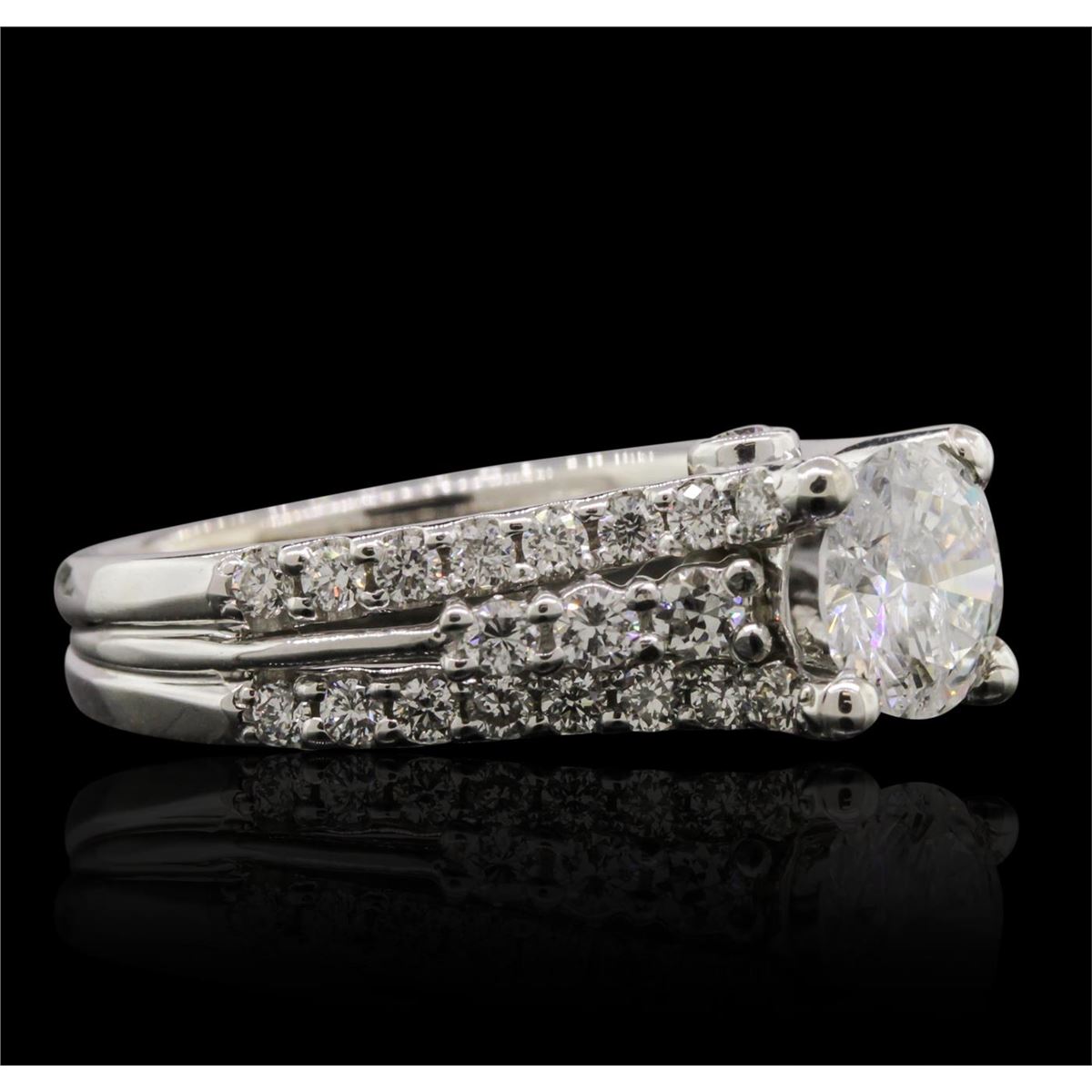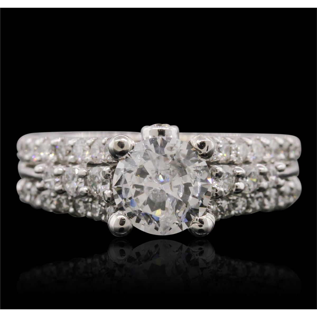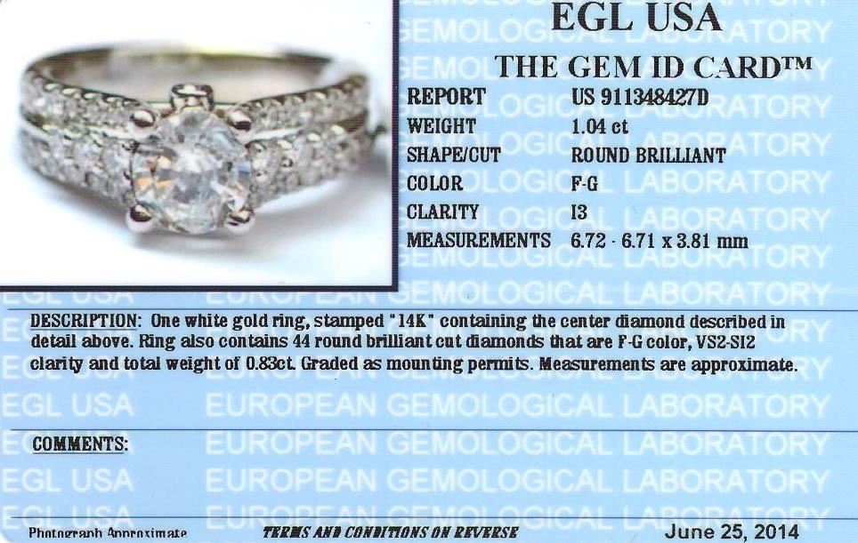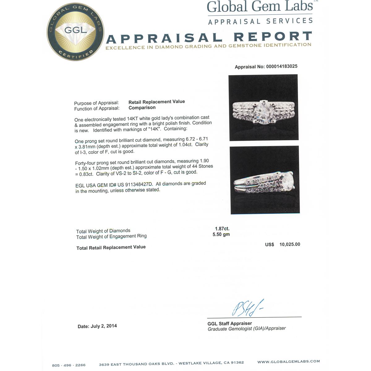 One electronically tested 14KT white gold Ladies combination cast & assembled engagement ring with a bright polish finish. Condition is new. Identified with markings of "14K". Containing: One prong set round brilliant cut diamond, measuring 6.72 - 6.71 x 3.81mm (depth est.) approximate. Total Weight of 1.04ct. Clarity: I-3. Color: F, Cut is Good. Forty-Four prong set round brilliant cut diamonds, measuring 1.90 - 1.50 x 1.02mm (depth est.) approximate. Total Weight of 44 Stones = 0.83ct. Clarity: VS-2 to SI-2. Color: F - G, Cut is Good. EGL USA GEM ID# US 911348427D. All diamonds are graded in the mounting, unless otherwise stated. Total Weight of Diamonds 1.87ct. Total Weight of Engagement Ring 5.50 grams. GGL Appraised at $10,025.00.