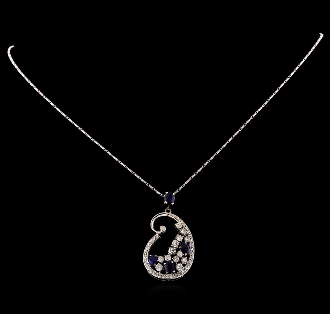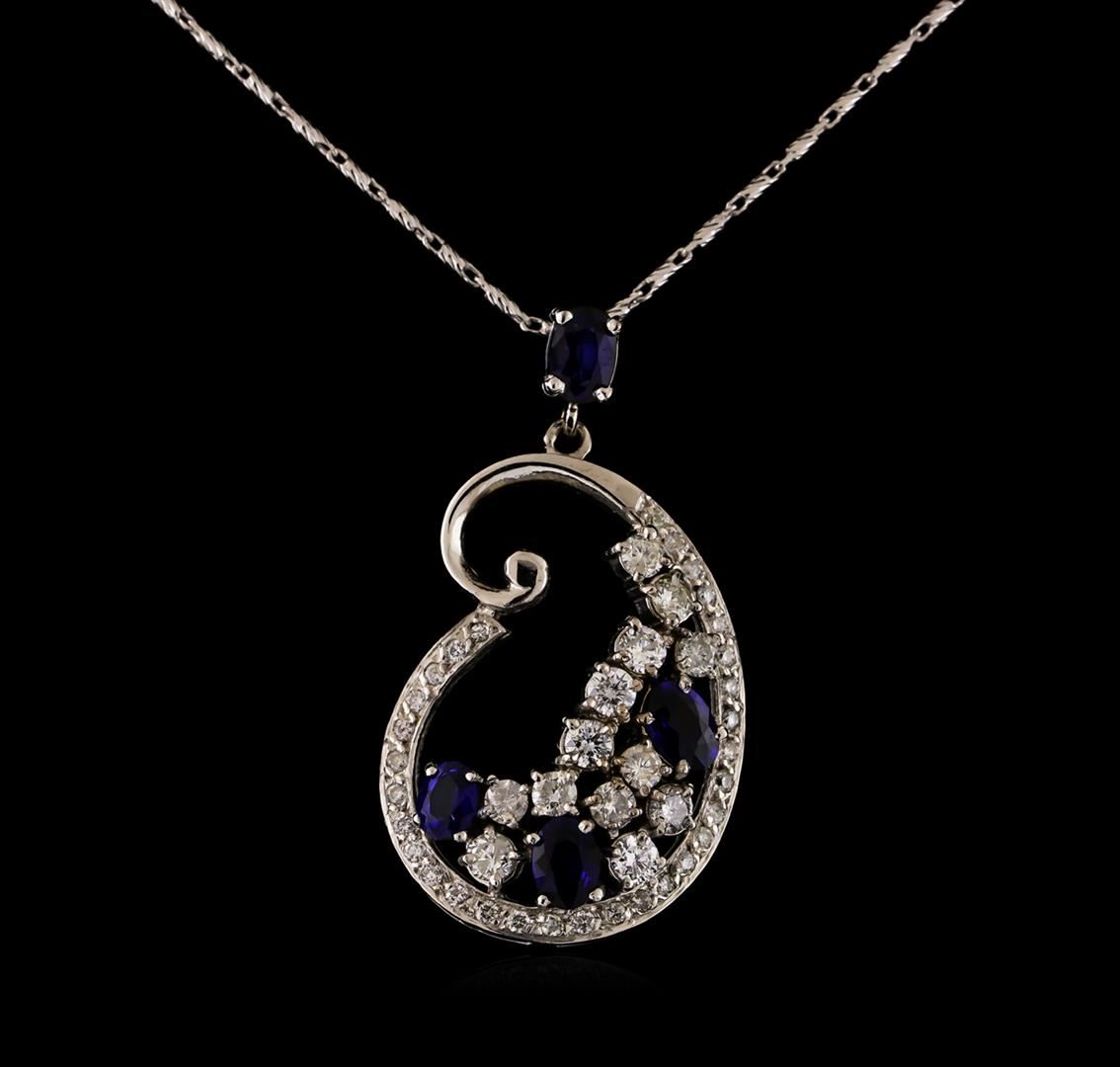 One electronically tested 14KT white gold ladies cast & assembled sapphire and diamond pendant with chain. Condition is new, good workmanship. The pendant features a stylized sapphire and diamond cluster pendant, completed by a sapphire set bail. The pendant is supported by an eighteen inch length 14KT white gold designer style chain, terminating in a lobster claw clasp. Bright polish finish. Containing: Four prong set oval mixed cut natural blue sapphires, measuring 5.50 x 4.00 x 2.40mm, 8%. bulge factor, approximate. Total Weight of 1.88ct., clarity is slightly included, type II, medium dark, moderately strong, blue color, (GIA B 6/4), cut is good. Transmitting light with a minimum of distortion, transparent. Naturally occurring internal & external characteristics are present. Measurements & the color grade are an average for the group. Indications of laboratory high temperature diffusion treatment. Graded in the setting. Thirteen prong set round brilliant cut diamonds, measuring 3.00 - 2.50 x 1.65mm (depth est.) approximate. Total Weight of 13 Stones = 1.09ct. Graded in the setting. Clarity: SI-2 to I-1. Color: H - J Thirty-One bead set round brilliant cut diamonds, measuring 1.60 - 1.50 x 0.93mm (depth est.) approximate. Total Weight of 31 Stones = 0.53ct. Graded in the setting. Clarity: I-1 to I-2. Color: G - I. Total Weight of Colored Stones 1.88ct. Total Weight of Diamonds 1.62ct. Total Weight of Pendant With Chain 11.20 grams. AIG Appraised at $7,100.00.