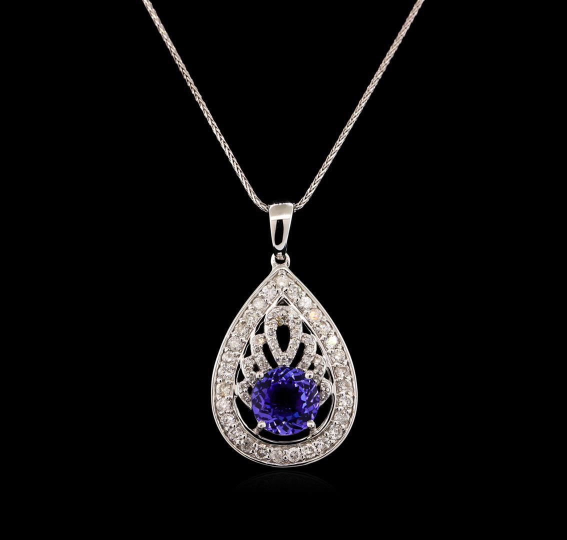 One electronically tested 14KT white gold Ladies combination cast & assembled pendant & chain 17.0" long, medium fancy link with a lobster claw clasp with a bright polish finish. Condition is new. Identified with markings of "14K". Containing: One prong set round round modified brilliant cut natural tanzanite, measuring 7.80 - 7.80 x 4.60 mm, approximate. Total Weight of 1.88ct., clarity is eye clean, type I, medium light, very slightly grayish, violet color, (GIA V 4/3), cut is good. Colored gemstones are presumed to have been subjected to commonly used color/clarity enhancement processes. Sixty prong set round brilliant cut diamonds, measuring 1.70 - 1.70 x 1.02mm (depth est.) approximate. Total Weight of 60 Stones = 1.07ct. Clarity: SI-2 to I-2. Color: I - J, Cut is Good. Total Weight of Colored Stones 1.88ct. Total Weight of Diamonds 1.07ct. Total Weight of Pendant & Chain 5.20 grams. GGL Appraised at $6,770.00.