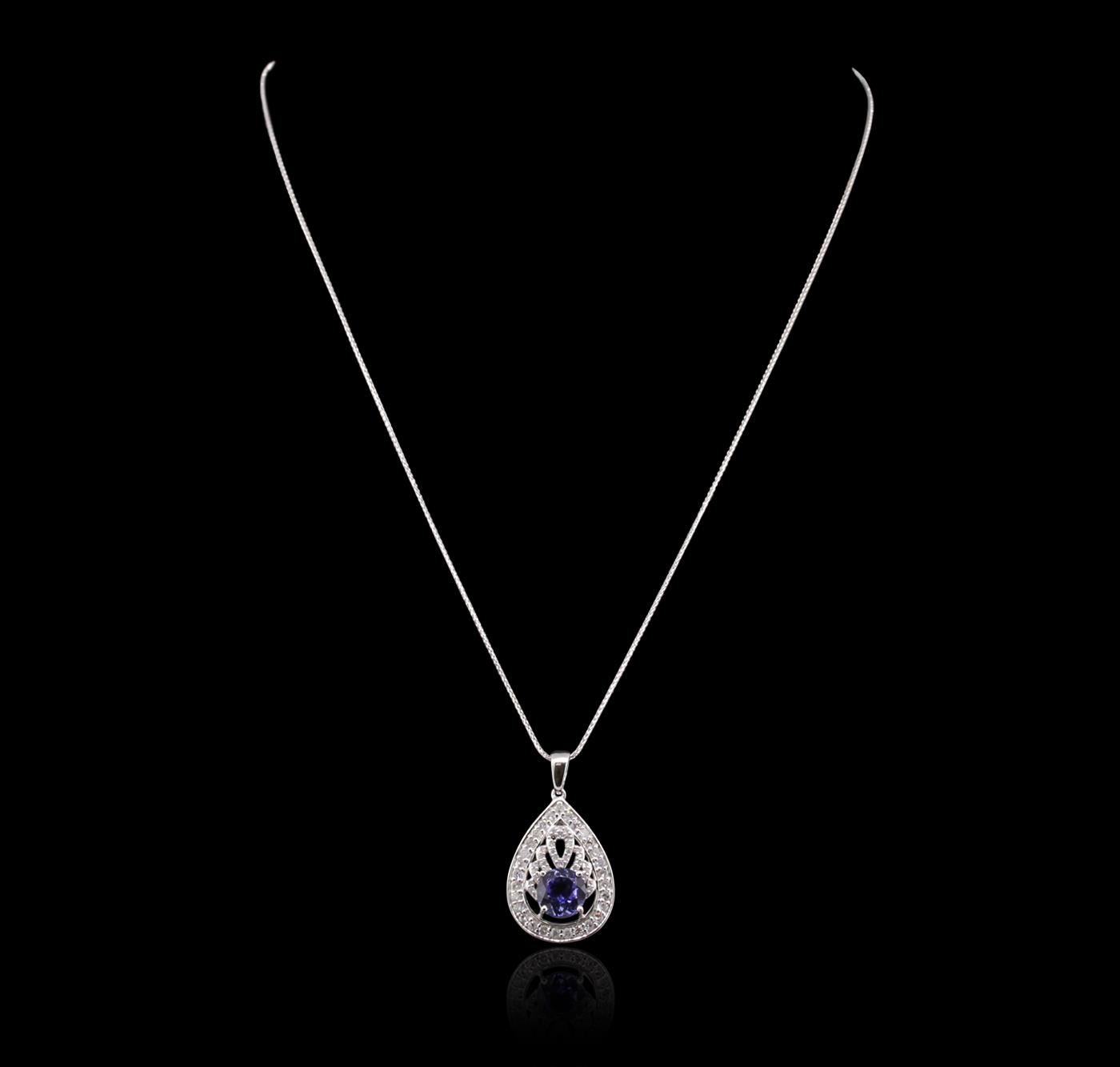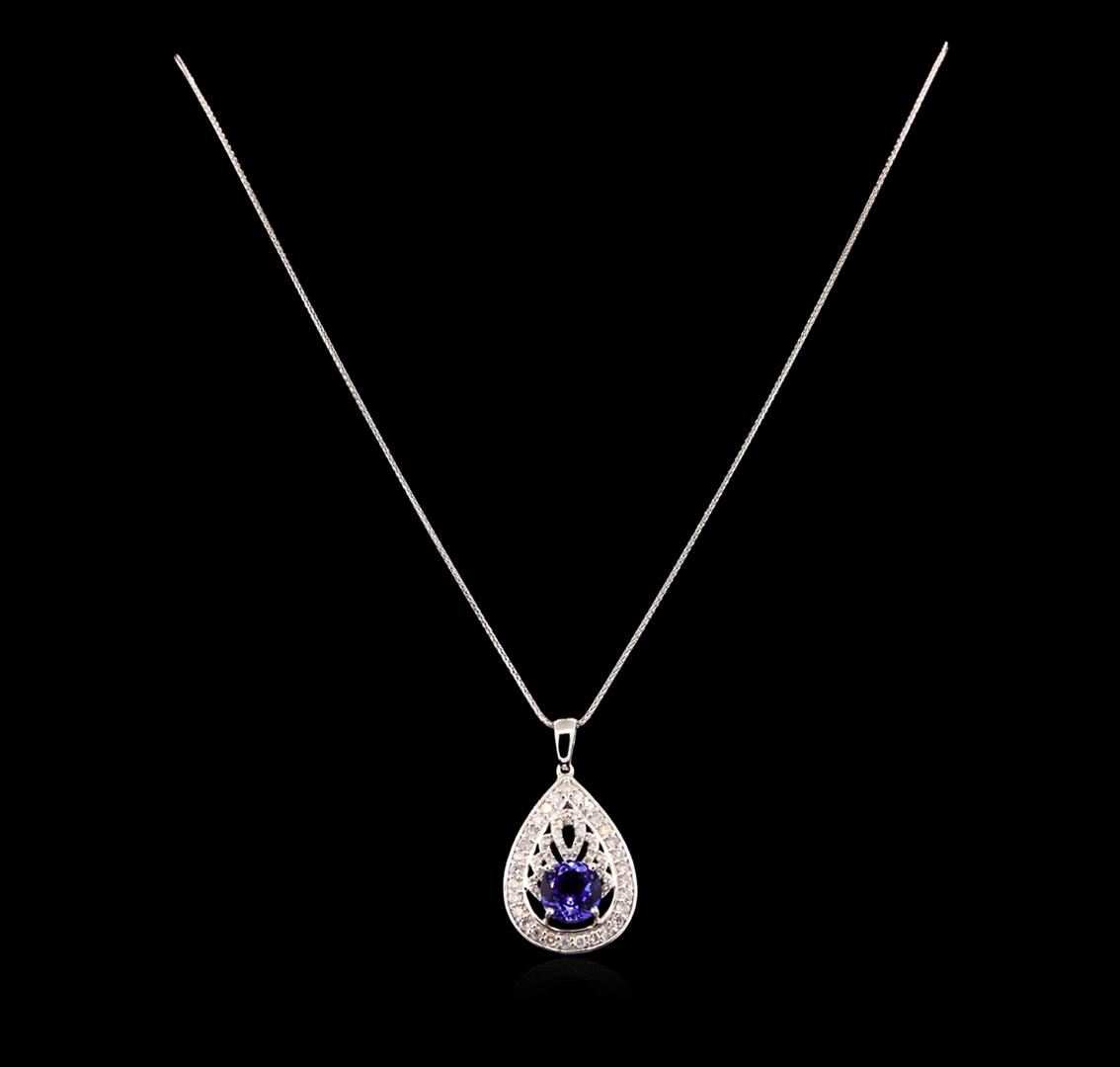One electronically tested 14KT white gold Ladies combination cast & assembled pendant & chain 17.0" long, medium fancy link with a lobster claw clasp with a bright polish finish. Condition is new. Identified with markings of "14K". Containing: One prong set round round modified brilliant cut natural tanzanite, measuring 7.80 - 7.80 x 4.60 mm, approximate. Total Weight of 1.88ct., clarity is eye clean, type I, medium light, very slightly grayish, violet color, (GIA V 4/3), cut is good. Colored gemstones are presumed to have been subjected to commonly used color/clarity enhancement processes. Sixty prong set round brilliant cut diamonds, measuring 1.70 - 1.70 x 1.02mm (depth est.) approximate. Total Weight of 60 Stones = 1.07ct. Clarity: SI-2 to I-2. Color: I - J, Cut is Good. Total Weight of Colored Stones 1.88ct. Total Weight of Diamonds 1.07ct. Total Weight of Pendant & Chain 5.20 grams. GGL Appraised at $6,770.00.