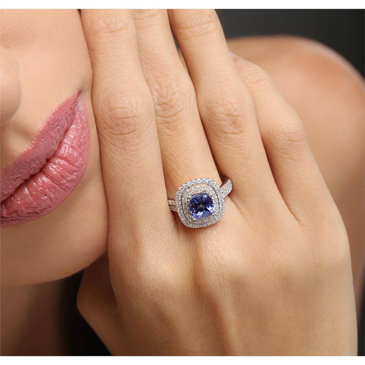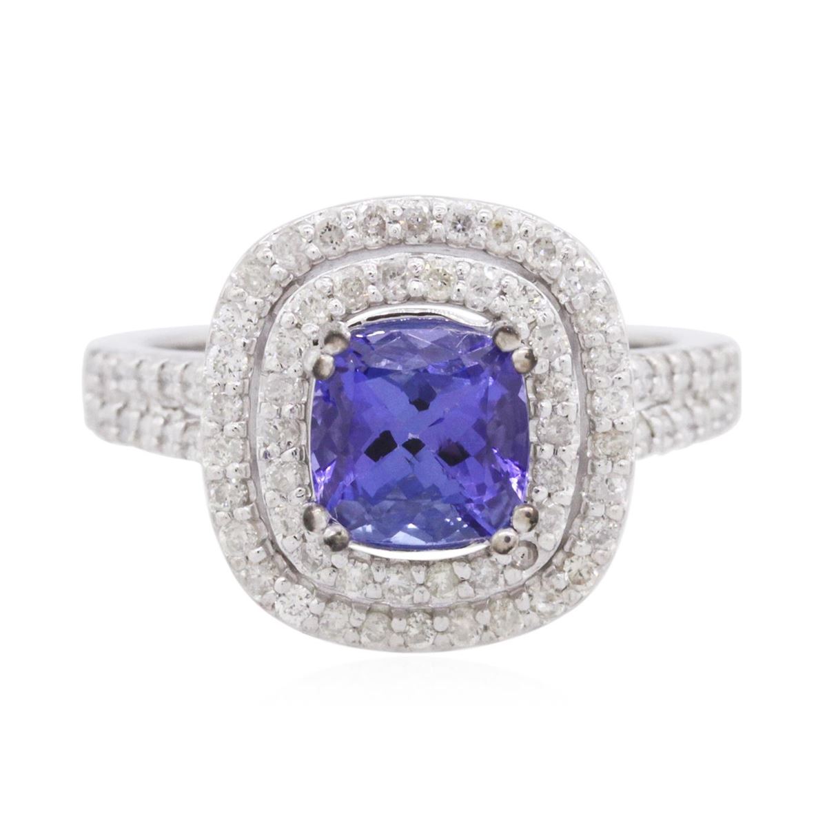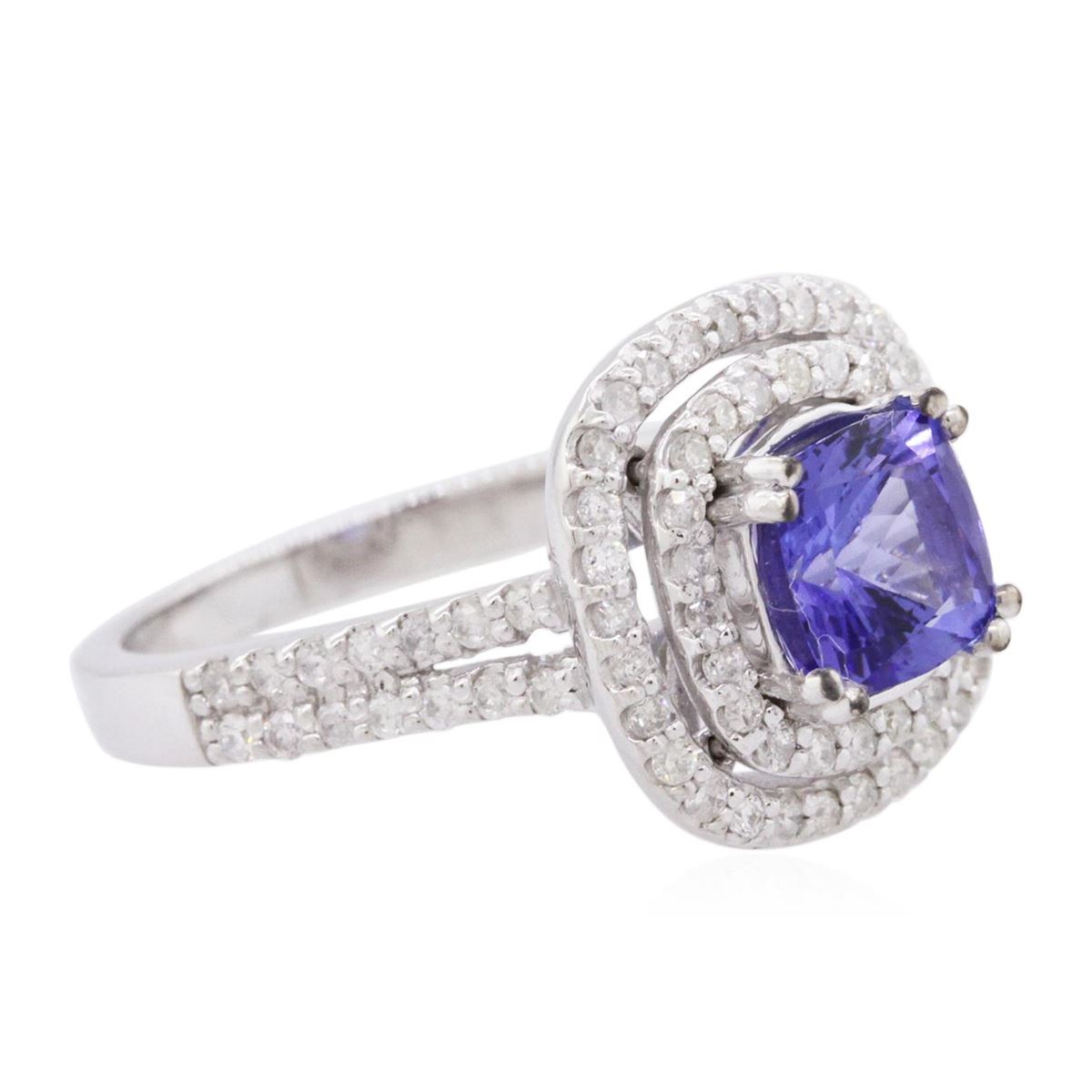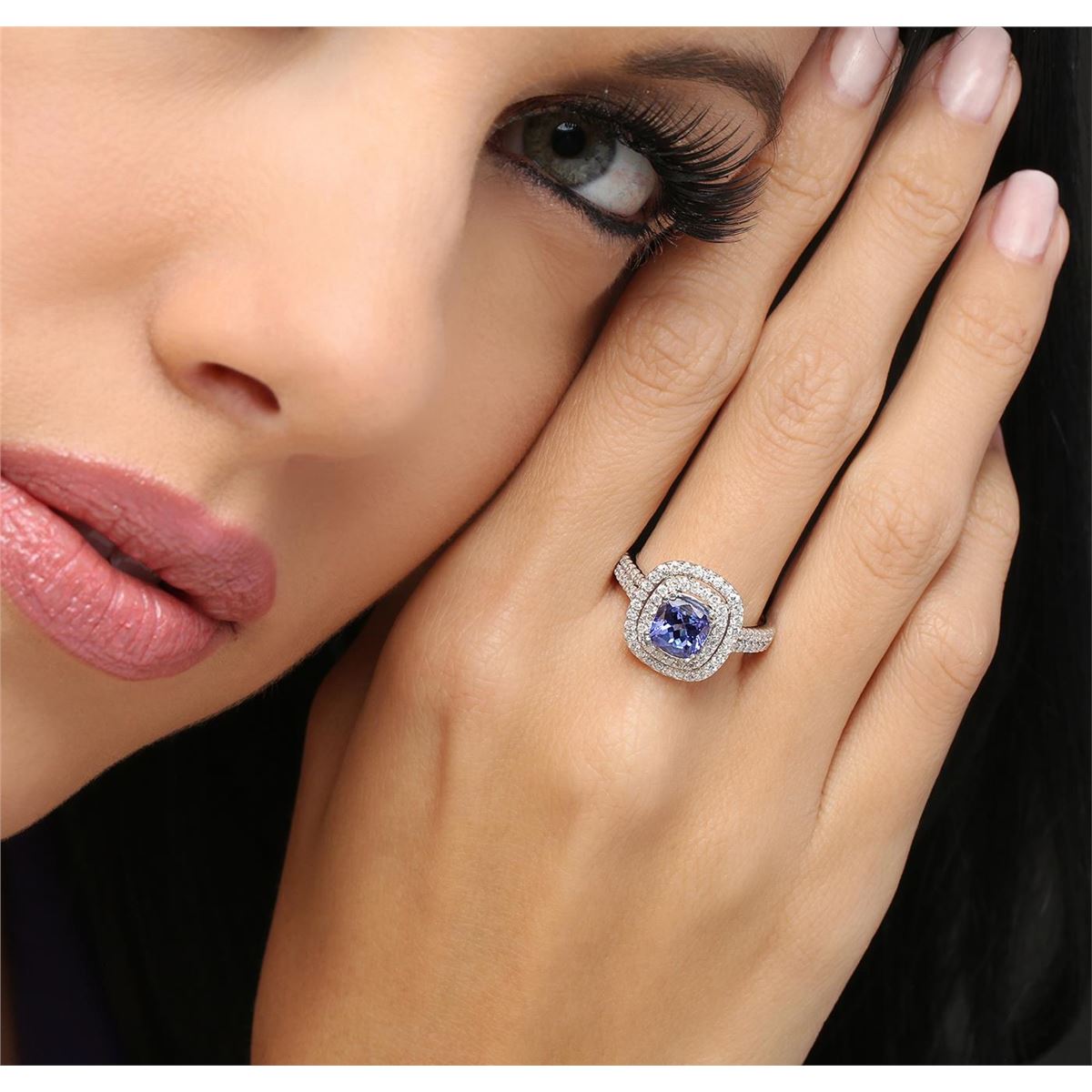 One electronically tested 14KT white gold ladies cast tanzanite & diamond ring with a bright finish. The featured tanzanite is set within a tiered diamond bezel, supported by diamond set shoulders, completed by a two millimeter wide band. Identified with markings of "K14". Condition is new, good workmanship. Containing: One prong set square cushion brilliant cut natural tanzanite, measuring 6.52 x 6.40 x 5.20mm, 10% bulge factor, approximate weight of 1.88ct., clarity is eye clean, type I, medium dark, slightly grayish, violetish blue color, (GIA vB 6/2), cut is good. Transmitting light with no distortion, transparent. Graded in the setting. Tanzanite is a very rare gemstone that is only found in the country of Tanzania. Originally discovered in 1967. Tiffany & Company, named the stone Tanzanite. It is found in the Usumburu Mountains that border the Umba Valley of northern Tanzania. Tanzanite occurs in gray, brown, violet, blue, reddish-purple, & green. The gem is interesting because of its exceptional pleochroism. Rotated in different directions a tanzanite will exhibit multiple changes of color. Tanzanite has a low tolerance to ultrasonic cleaning, and should not be cleaned using this method. Seventy prong set round brilliant cut diamonds, measuring 1.30 - 1.20 x 0.75mm (depth est.) approximate total weight of 70 Stones = 0.50ct. Graded in the setting. Clarity: I-1 to I-2. Color: H - J. Total Weight of Colored Stones 1.88ct. Total Weight of Diamonds 0.50ct. Total Weight of Ring 5.45 grams. AIG Appraised at $5,150.00.