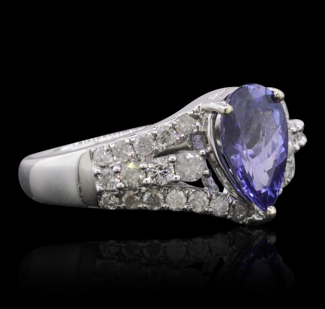 One electronically tested 14KT white gold ladies combination cast & assembled tanzanite and diamond ring with a split shank with a bright polish finish. Identified with markings of "14K". Condition is new. Containing: One prong set pear modified brilliant cut natural tanzanite, measuring 10.51 x 6.32 x 4.22mm, approximate weight of 1.88ct., clarity is eye clean, type I, medium, very slightly grayish, violet color, (GIA V 5/3), cut is good. Thirty-Two prong set round brilliant cut diamonds, measuring 2.10 - 1.50 x 1.08mm (depth est.) approximate total weight of 32 Stones = 0.50ct. Clarity: I-1 to I-2. Color: I - J, Cut is Good. Colored gemstones are presumed to have been subjected to commonly used enhancement processes. All diamonds and colored gemstones are graded in the mounting, unless otherwise stated. Total Weight of Colored Stones 1.88ct. Total Weight of Diamonds 0.50ct. Total Weight of Ring 4.70 grams. GGL Appraised at $5,140.00.