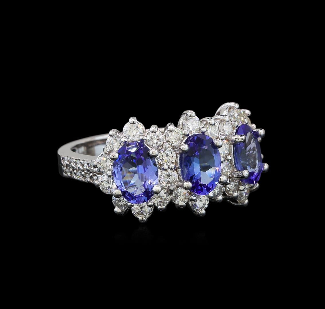 One electronically tested 14KT white gold ladies cast tanzanite and diamond ring with a flat shank with a bright polish finish. Identified with markings of "K14". Condition is new. Containing: Three prong set oval modified brilliant cut natural tanzanites, measuring 6.73 x 4.89 x 2.97mm, exact total weight 1.88ct., clarity is eye clean, type I, medium light, very slightly grayish, violet color, (GIA V 4/3), cut is good. Twenty-Six prong set round brilliant cut diamonds, measuring 2.20 - 2.20 x 1.32mm (depth est.) exact total weight 26 Stones = 0.91ct. Clarity: SI-1 to I-1. Color: I - J, Cut is Good. Twenty prong set round brilliant cut diamonds, measuring 1.10 - 1.10 x 0.66mm (depth est.) exact total weight 20 Stones = 0.10ct. Clarity: SI-2 to I-1. Color: I - J, Cut is Good. All diamonds and colored gemstones are graded in the mounting, unless otherwise stated. Colored gemstones are presumed to have been subjected to commonly used enhancement processes.. Total Weight of Colored Stones 1.88ct. Total Weight of Diamonds 1.01ct. Total Weight of Ring 5.00 grams. GGL Appraised at $3,325.00.