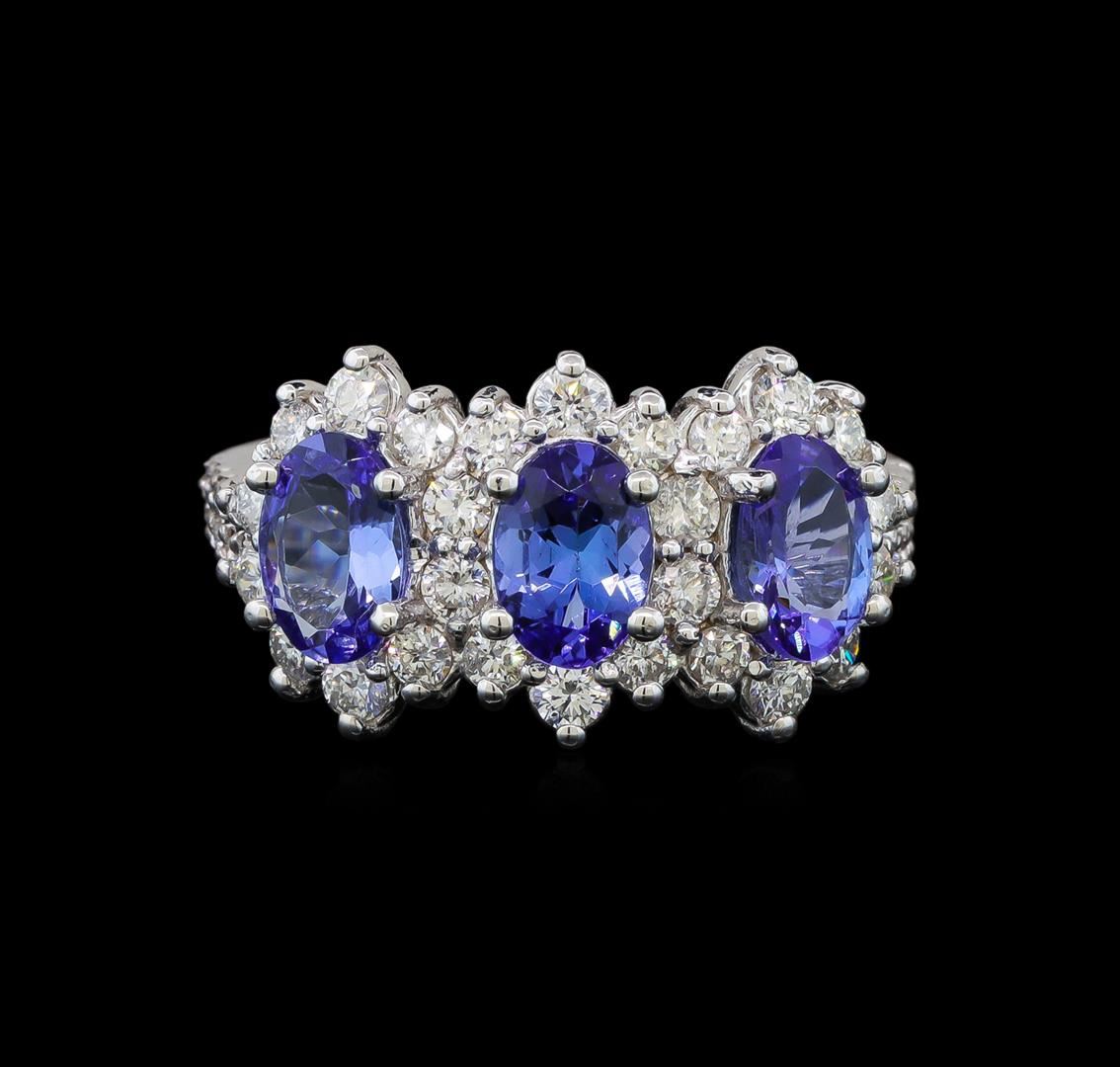 One electronically tested 14KT white gold ladies cast tanzanite and diamond ring with a flat shank with a bright polish finish. Identified with markings of "K14". Condition is new. Containing: Three prong set oval modified brilliant cut natural tanzanites, measuring 6.73 x 4.89 x 2.97mm, exact total weight 1.88ct., clarity is eye clean, type I, medium light, very slightly grayish, violet color, (GIA V 4/3), cut is good. Twenty-Six prong set round brilliant cut diamonds, measuring 2.20 - 2.20 x 1.32mm (depth est.) exact total weight 26 Stones = 0.91ct. Clarity: SI-1 to I-1. Color: I - J, Cut is Good. Twenty prong set round brilliant cut diamonds, measuring 1.10 - 1.10 x 0.66mm (depth est.) exact total weight 20 Stones = 0.10ct. Clarity: SI-2 to I-1. Color: I - J, Cut is Good. All diamonds and colored gemstones are graded in the mounting, unless otherwise stated. Colored gemstones are presumed to have been subjected to commonly used enhancement processes.. Total Weight of Colored Stones 1.88ct. Total Weight of Diamonds 1.01ct. Total Weight of Ring 5.00 grams. GGL Appraised at $3,325.00.