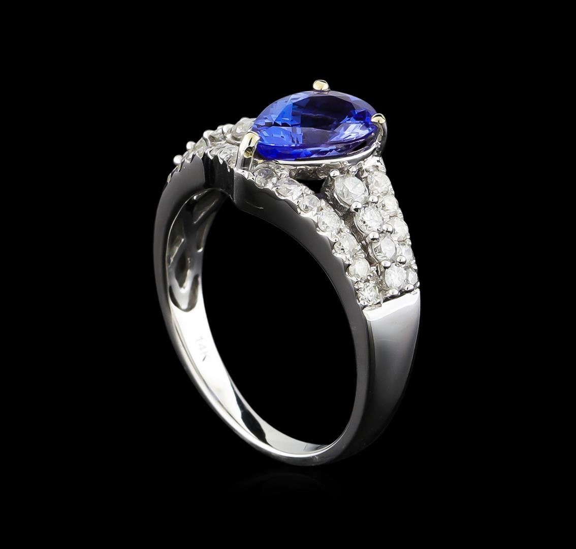 One electronically tested 14KT white gold ladies combination cast & assembled tanzanite and diamond ring with a split shank with a bright polish finish. Identified with markings of "14K". Condition is new. Containing: One prong set pear modified brilliant cut natural tanzanite, measuring 10.51 x 6.32 x 4.22mm, approximate weight of 1.88ct., clarity is eye clean, type I, medium, very slightly grayish, violet color, (GIA V 5/3), cut is good. Thirty-Two prong set round brilliant cut diamonds, measuring 2.10 - 1.50 x 1.08mm (depth est.) approximate total weight of 32 Stones = 0.50 ct. Clarity: I-1 to I-2. Color: I - J, Cut is Good. Colored gemstones are presumed to have been subjected to commonly used enhancement processes. All diamonds and colored gemstones are graded in the mounting, unless otherwise stated. Total Weight of Colored Stones 1.88ct. Total Weight of Diamonds 0.50 ct. Total Weight of Ring 4.70 grams. GGL Appraised.