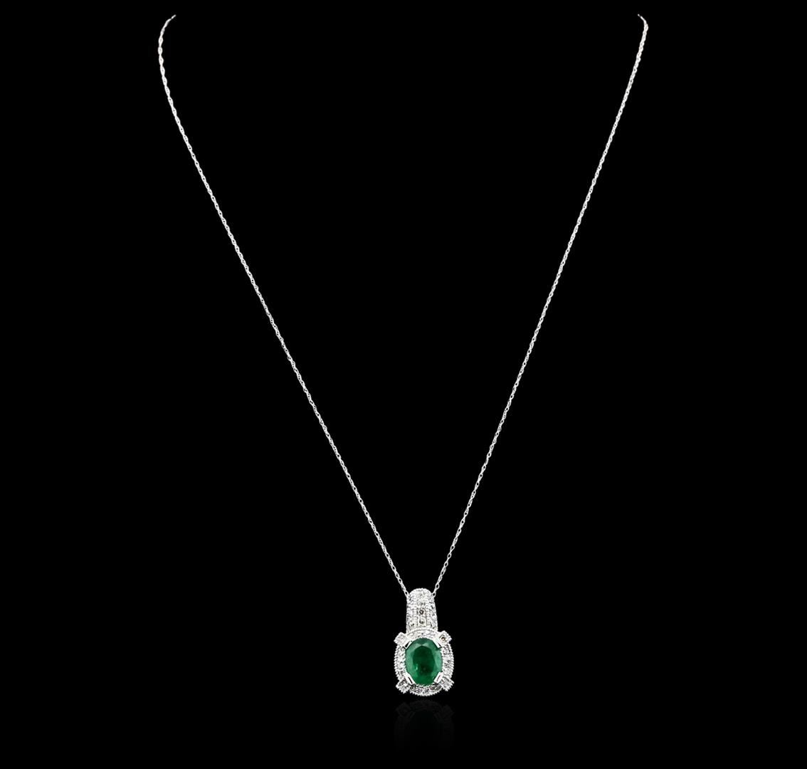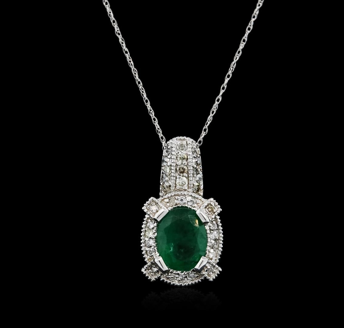 One pendant with chain featuring: 14KT white gold weighing 4.47 grams containing one emerald with a total weight of 1.88ct and round diamonds with a total weight of 0.36cts.