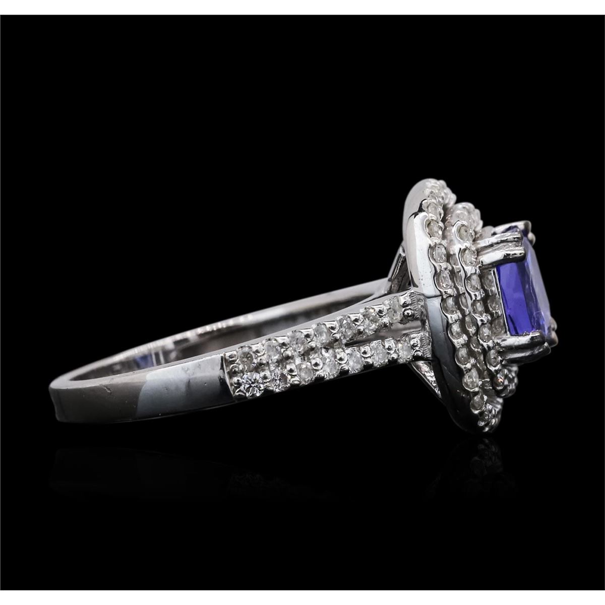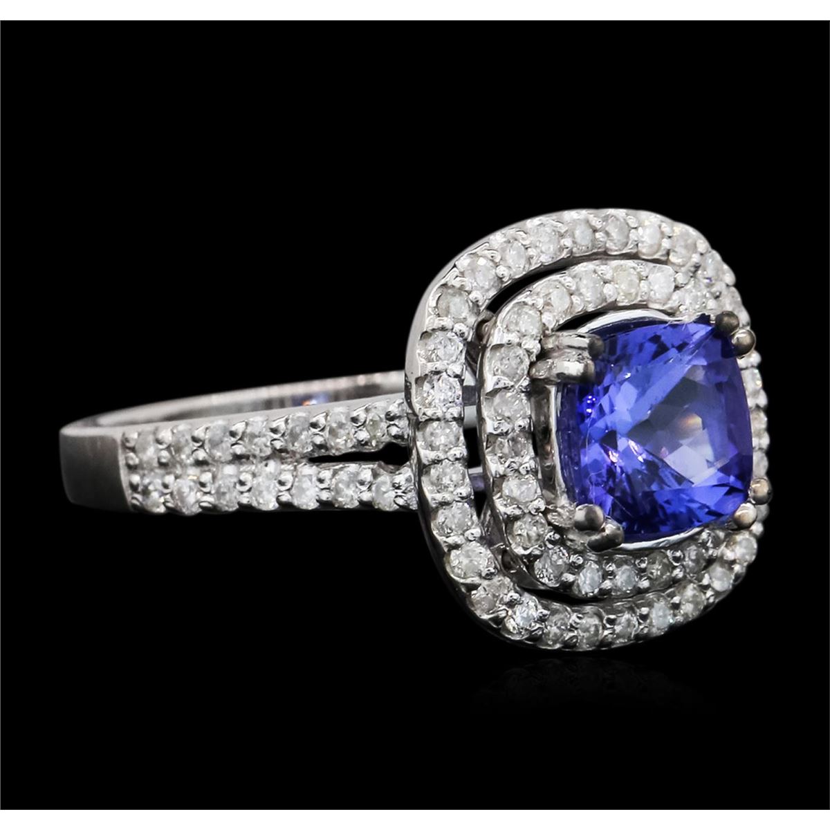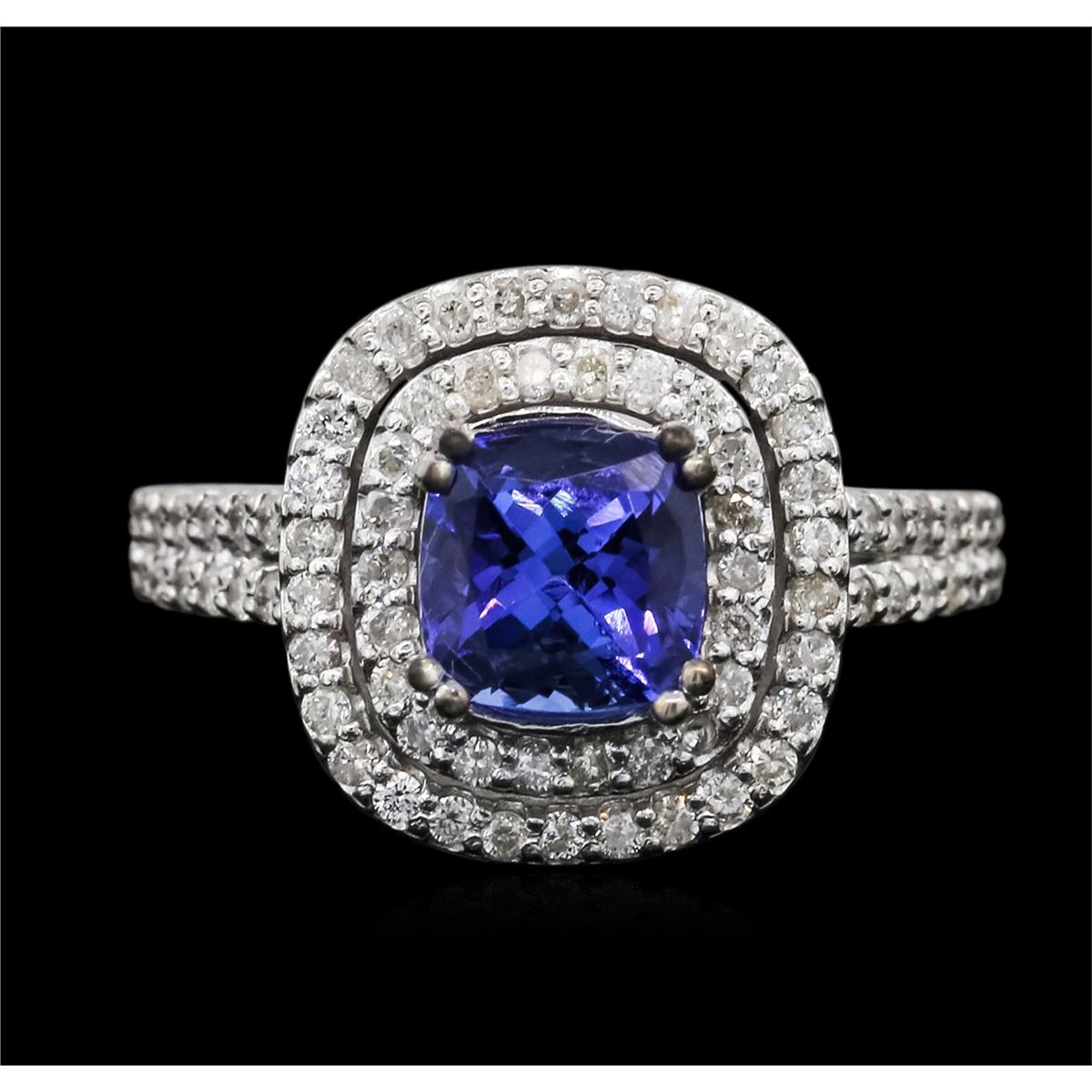 One electronically tested 14KT white gold ladies cast tanzanite & diamond ring with a bright finish. The featured tanzanite is set within a tiered diamond bezel, supported by diamond set shoulders, completed by a two millimeter wide band. Identified with markings of "K14". Condition is new, good workmanship. Containing: One prong set square cushion brilliant cut natural tanzanite, measuring 6.52 x 6.40 x 5.20mm, 10% bulge factor, approximate weight of 1.88ct., clarity is eye clean, type I, medium dark, slightly grayish, violetish blue color, (GIA vB 6/2), cut is good. Transmitting light with no distortion, transparent. Graded in the setting. Tanzanite is a very rare gemstone that is only found in the country of Tanzania. Originally discovered in 1967. Tiffany & Company, named the stone Tanzanite. It is found in the Usumburu Mountains that border the Umba Valley of northern Tanzania. Tanzanite occurs in gray, brown, violet, blue, reddish-purple, & green. The gem is interesting because of its exceptional pleochroism. Rotated in different directions a tanzanite will exhibit multiple changes of color. Tanzanite has a low tolerance to ultrasonic cleaning, and should not be cleaned using this method. Seventy prong set round brilliant cut diamonds, measuring 1.30 - 1.20 x 0.75mm (depth est.) approximate total weight of 70 Stones = 0.50ct. Graded in the setting. Clarity: I-1 to I-2. Color: H - J. Total Weight of Colored Stones 1.88ct. Total Weight of Diamonds 0.50ct. Total Weight of Ring 5.45 grams. AIG Appraised at $5,150.00.