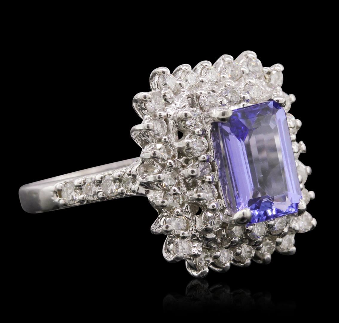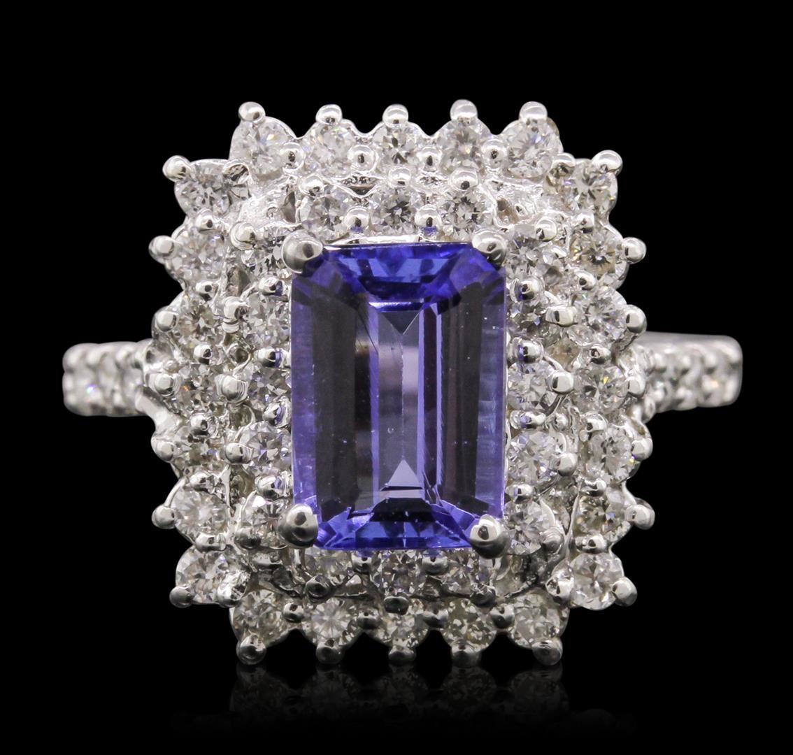 One electronically tested 14KT white gold ladies cast tanzanite and diamond ring with a bright polish finish. The featured tanzanite is set within two tiered diamond bezels supported by diamond set shoulders, completed by two millimeter wide band. Identified with markings of "K14". Condition is new, good workmanship. Containing: One prong set rectangular step cut natural tanzanite, measuring 8.70 x 6.10 x 3.70mm, approximate weight of 1.88ct., clarity is slightly included, type I, medium dark, very slightly grayish, bluish violet color, (GIA bV 6/3), cut is good. Transmitting light with no distortion, transparent. Graded in the setting.Tanzanite is a very rare gemstone that is only found in the country of Tanzania. Originally discovered in 1967. Tiffany & Company, named the stone Tanzanite. It is found in the Usumburu Mountains that border the Umba Valley of northern Tanzania. Tanzanite occurs in gray, brown, violet, blue, reddish-purple, & green. The gem is interesting because of its exceptional pleochroism. Rotated in different directions a tanzanite will exhibit multiple changes of color. Tanzanite has a low tolerance to ultrasonic cleaning, and should not be cleaned using this method.Forty-Eight prong set round brilliant cut diamonds, measuring 1.70 - 1.70 x 1.02mm (depth est.) approximate. Total Weight of 48 Stones = 0.89ct. Graded in the setting. Clarity: SI-1 to I-1 . Color: G - I. Total Weight of Colored Stones 1.88ct. Total Weight of Diamonds 0.89ct. Total Weight of Ring 6.01gm. AIG Appraised at $7,455.00.