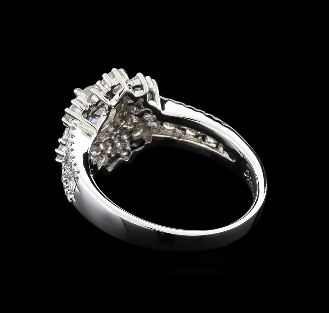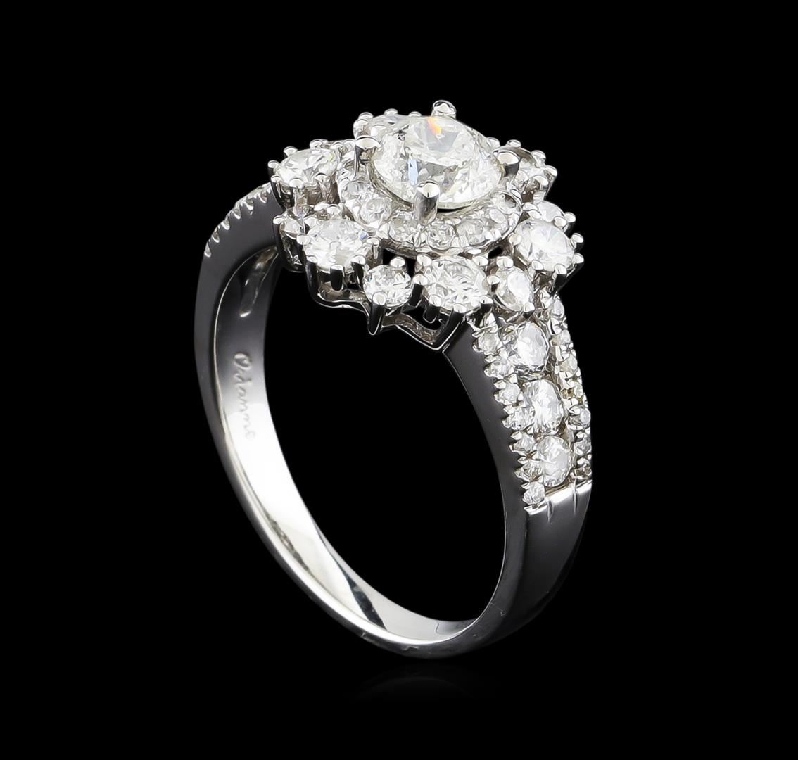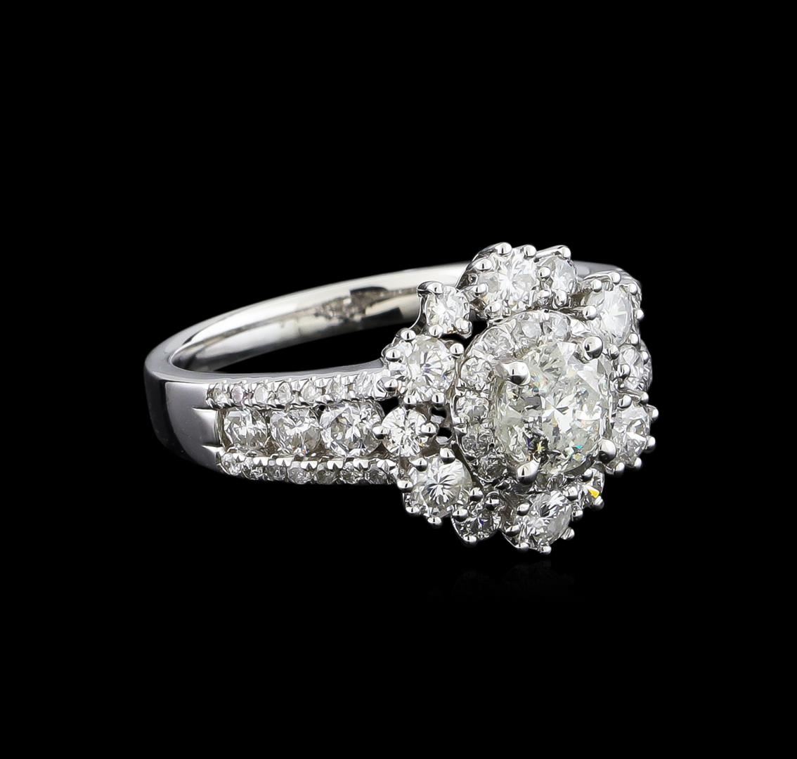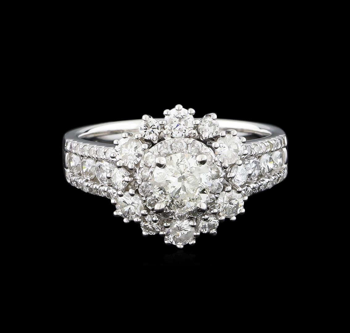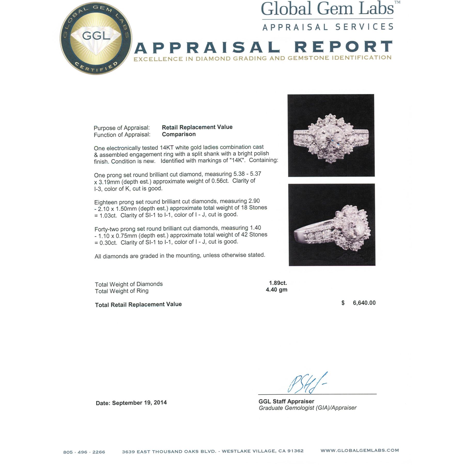One electronically tested 14KT white gold ladies combination cast & assembled engagement ring with a split shank with a bright polish finish. Identified with markings of "14K". Condition is new. Containing: One prong set round brilliant cut diamond, measuring 5.38 - 5.37 x 3.19mm (depth est.) approximate weight of 0.56ct. Clarity: I-3. Color: K, Cut is Good. Eighteen prong set round brilliant cut diamonds, measuring 2.90 - 2.10 x 1.50mm (depth est.) approximate total weight of 18 Stones = 1.03ct. Clarity: SI-1 to I-1. Color: I - J, Cut is Good. Forty-Two prong set round brilliant cut diamonds, measuring 1.40 - 1.10 x 0.75mm (depth est.) approximate total weight of 42 Stones = 0.30ct. Clarity: SI-1 to I-1. Color: I - J, Cut is Good. All diamonds are graded in the mounting, unless otherwise stated. Total Weight of Diamonds 1.89ct. Total Weight of Ring 4.40 grams. GGL Appraised.