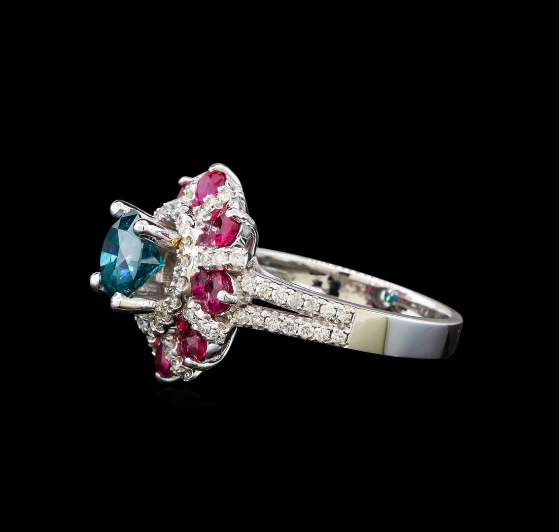 One electronically tested 14KT white gold ladies cast diamond and ruby ring with a bright polish finish. Identified with markings of "K14". Condition is new. Containing: One prong set round brilliant cut diamond, measuring 7.10 - 7.10 x 4.26mm (depth est.) approximate weight of 1.31ct. Clarity: I-3, Cut is Good. Seventy-Three prong set round brilliant cut diamonds, measuring 1.30 - 1.30 x 0.78mm (depth est.) approximate total weight of 73 Stones = 0.58ct. Clarity: SI-2 to I-1. Color: I - J, Cut is Good. Eight prong set round modified brilliant cut natural rubies, measuring 3.20 - 3.20 x 2.08 mm, approximate total weight of 1.36ct., clarity is heavily included, medium light, moderately strong, strongly purplish red color, (GIA stpR 4/4), cut is good. Colored gemstones are presumed to have been subjected to commonly used enhancement processes. All diamonds and colored gemstones are graded in the mounting, unless otherwise stated. Total Weight of Colored Stones 1.36ct. Total Weight of Diamonds 1.89ct. Total Weight of Ring 7.00 grams. GGL Appraised at $5,705.00.