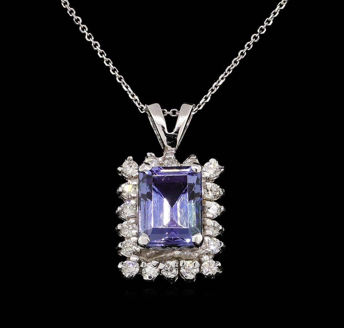 One electronically tested 14KT white gold ladies combination cast & assembled tanzanite and diamond pendant & chain 16.0" long, cable link with a spring ring clasp with a bright polish finish. Identified with markings of "14K". Condition is new. Containing: One prong set emerald standard step cut natural tanzanite, measuring 8.90 x 7.00 x 3.36mm, approximate weight of 1.89ct., clarity is eye clean, type I, medium light, slightly grayish, violet color, (GIA V 4/2), cut is good. Eighteen prong set round brilliant cut diamonds, measuring 1.50 - 1.50 x 0.90mm (depth est.) approximate total weight of 18 Stones = 0.22ct. Clarity: SI-1 to SI-2. Color: I - J, Cut is Good. Colored gemstones are presumed to have been subjected to commonly used enhancement processes. All diamonds and colored gemstones are graded in the mounting, unless otherwise stated. Total Weight of Colored Stones 1.89ct. Total Weight of Diamonds 0.22ct. Total Weight of Pendant & Chain 4.40 grams. GGL Appraised at $3,285.00.