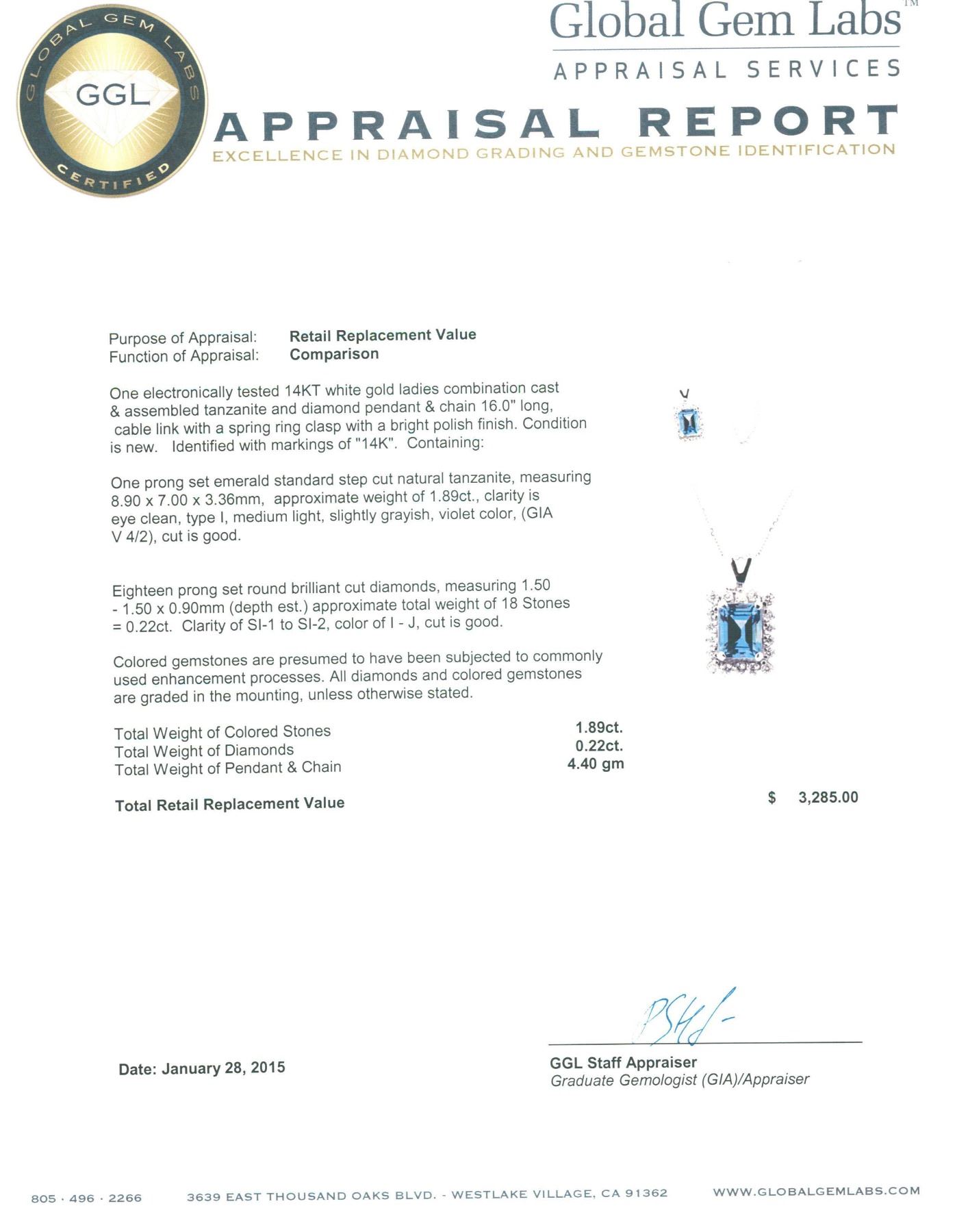 One electronically tested 14KT white gold ladies combination cast & assembled tanzanite and diamond pendant & chain 16.0" long, cable link with a spring ring clasp with a bright polish finish. Identified with markings of "14K". Condition is new. Containing: One prong set emerald standard step cut natural tanzanite, measuring 8.90 x 7.00 x 3.36mm, approximate weight of 1.89ct., clarity is eye clean, type I, medium light, slightly grayish, violet color, (GIA V 4/2), cut is good. Eighteen prong set round brilliant cut diamonds, measuring 1.50 - 1.50 x 0.90mm (depth est.) approximate total weight of 18 Stones = 0.22ct. Clarity: SI-1 to SI-2. Color: I - J, Cut is Good. Colored gemstones are presumed to have been subjected to commonly used enhancement processes. All diamonds and colored gemstones are graded in the mounting, unless otherwise stated. Total Weight of Colored Stones 1.89ct. Total Weight of Diamonds 0.22ct. Total Weight of Pendant & Chain 4.40 grams. GGL Appraised.