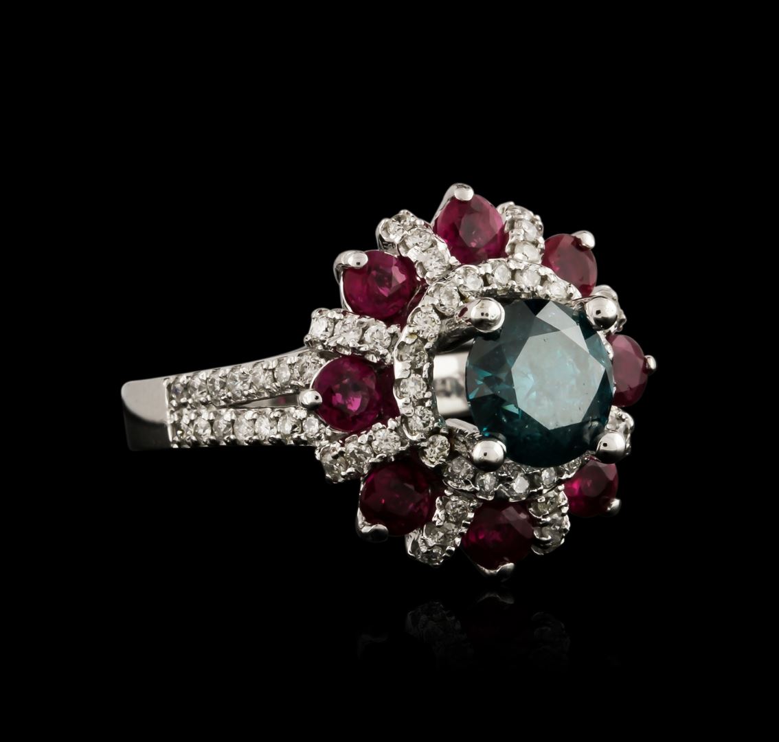 One electronically tested 14KT white gold ladies cast diamond and ruby ring with a bright polish finish. Identified with markings of "K14". Condition is new. Containing: One prong set round brilliant cut diamond, measuring 7.10 - 7.10 x 4.26mm (depth est.) approximate weight of 1.31ct. Clarity: I-3, Cut is Good. Seventy-Three prong set round brilliant cut diamonds, measuring 1.30 - 1.30 x 0.78mm (depth est.) approximate total weight of 73 Stones = 0.58ct. Clarity: SI-2 to I-1. Color: I - J, Cut is Good. Eight prong set round modified brilliant cut natural rubies, measuring 3.20 - 3.20 x 2.08 mm, approximate total weight of 1.36ct., clarity is heavily included, medium light, moderately strong, strongly purplish red color, (GIA stpR 4/4), cut is good. Colored gemstones are presumed to have been subjected to commonly used enhancement processes. All diamonds and colored gemstones are graded in the mounting, unless otherwise stated. Total Weight of Colored Stones 1.36ct. Total Weight of Diamonds 1.89ct. Total Weight of Ring 7.00 grams. GGL Appraised at $5,705.00.