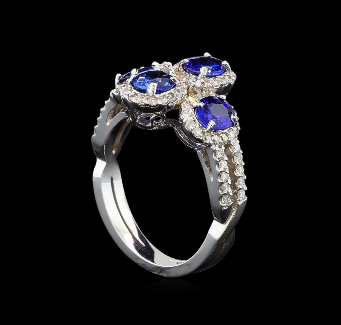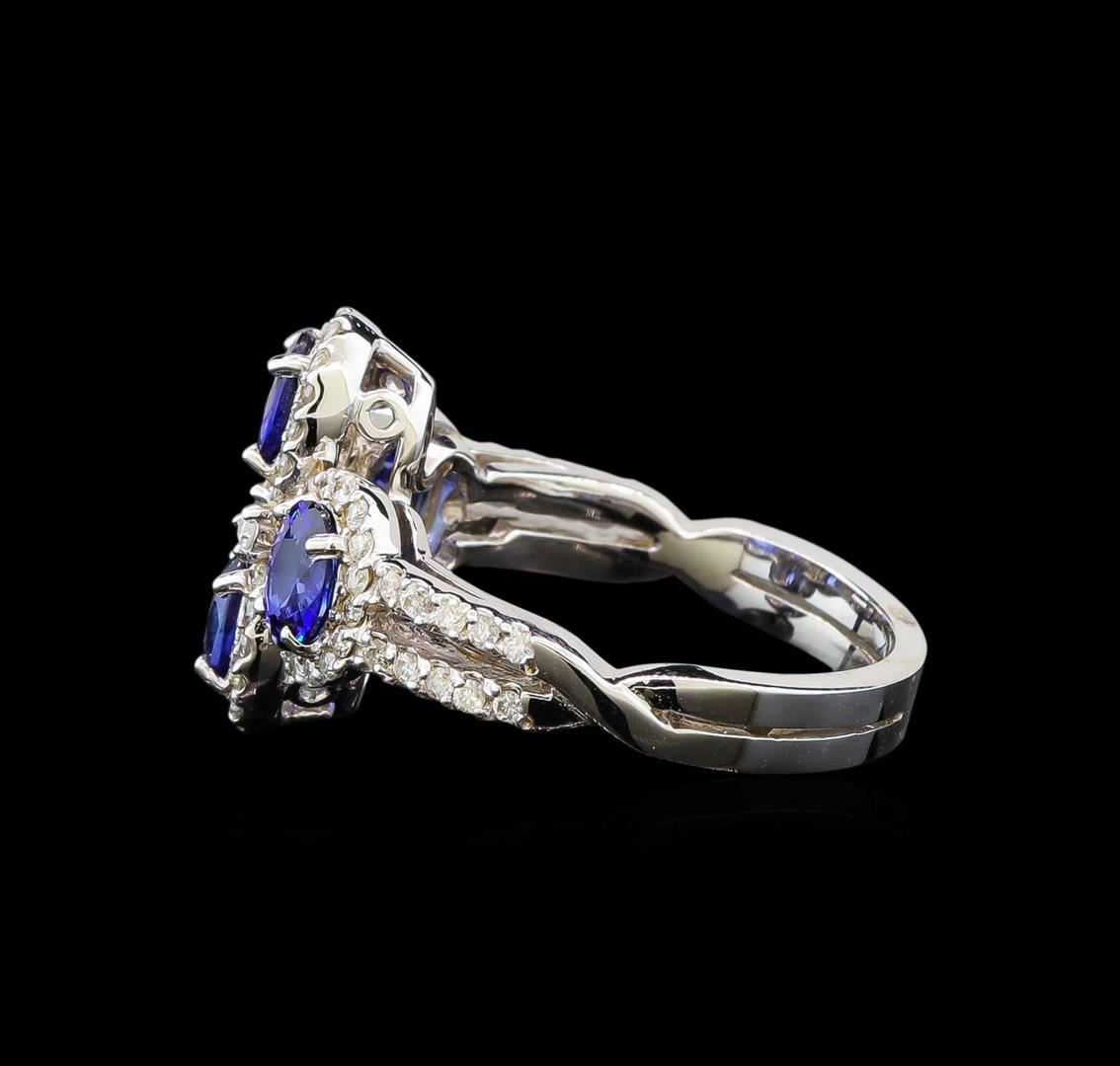 One electronically tested 14KT white gold ladies cast sapphire and diamond ring with a bright polish finish. Condition is new. Containing: Four prong set oval modified brilliant cut natural blue sapphires, measuring 5.20 x 4.20 x 2.73mm, approximate total weight of 1.90ct., clarity is eye clean, type II, medium, moderately strong, blue color, (GIA B 5/4), cut is good. Eighty-Six prong set round brilliant cut diamonds, measuring 1.30 - 1.10 x 0.72mm (depth est.) approximate total weight of 86 Stones = 0.60ct. Clarity: SI-1 to I-1. Color: I - J, Cut is Good. Colored gemstones are presumed to have been subjected to commonly used enhancement processes. All diamonds and colored gemstones are graded in the mounting, unless otherwise stated. Total Weight of Colored Stones 1.90ct. Total Weight of Diamonds 0.60ct. Total Weight of Ring 5.50 grams. GGL Appraised.