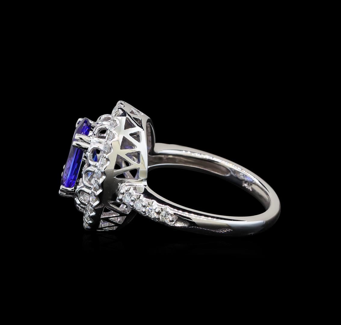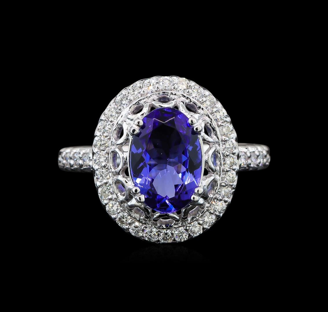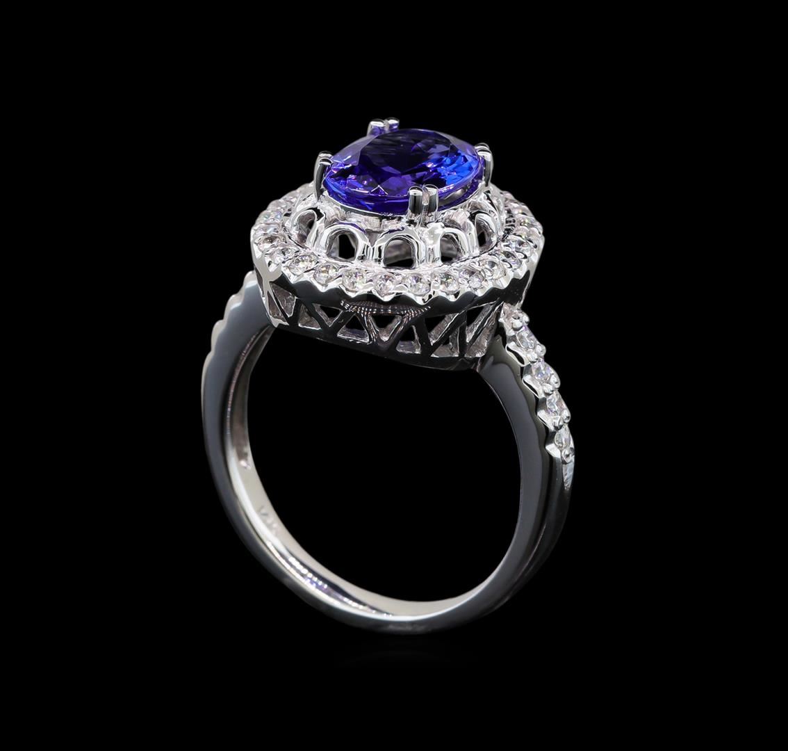 One electronically tested 14KT white gold ladies cast tanzanite and diamond ring with a bright polish finish. Identified with markings of "14K". Condition is new. Containing: One prong set oval modified brilliant cut natural tanzanite, measuring 10.50 x 7.30 x 4.75mm, approximate weight of 1.90ct., clarity is eye clean, type I, medium, moderately strong, violet color, (GIA V 5/4), cut is good. Thirty-Six prong set round brilliant cut diamonds, measuring 1.50 - 1.50 x 0.90mm (depth est.) approximate total weight of 36 Stones = 0.52ct. Clarity: SI-1 to SI-2. Color: I - J, Cut is Good. Colored gemstones are presumed to have been subjected to commonly used enhancement processes. All diamonds and colored gemstones are graded in the mounting, unless otherwise stated. Total Weight of Colored Stones 1.90ct. Total Weight of Diamonds 0.52ct. Total Weight of Ring 5.50 grams. GGL Appraised at $3,170.00.
