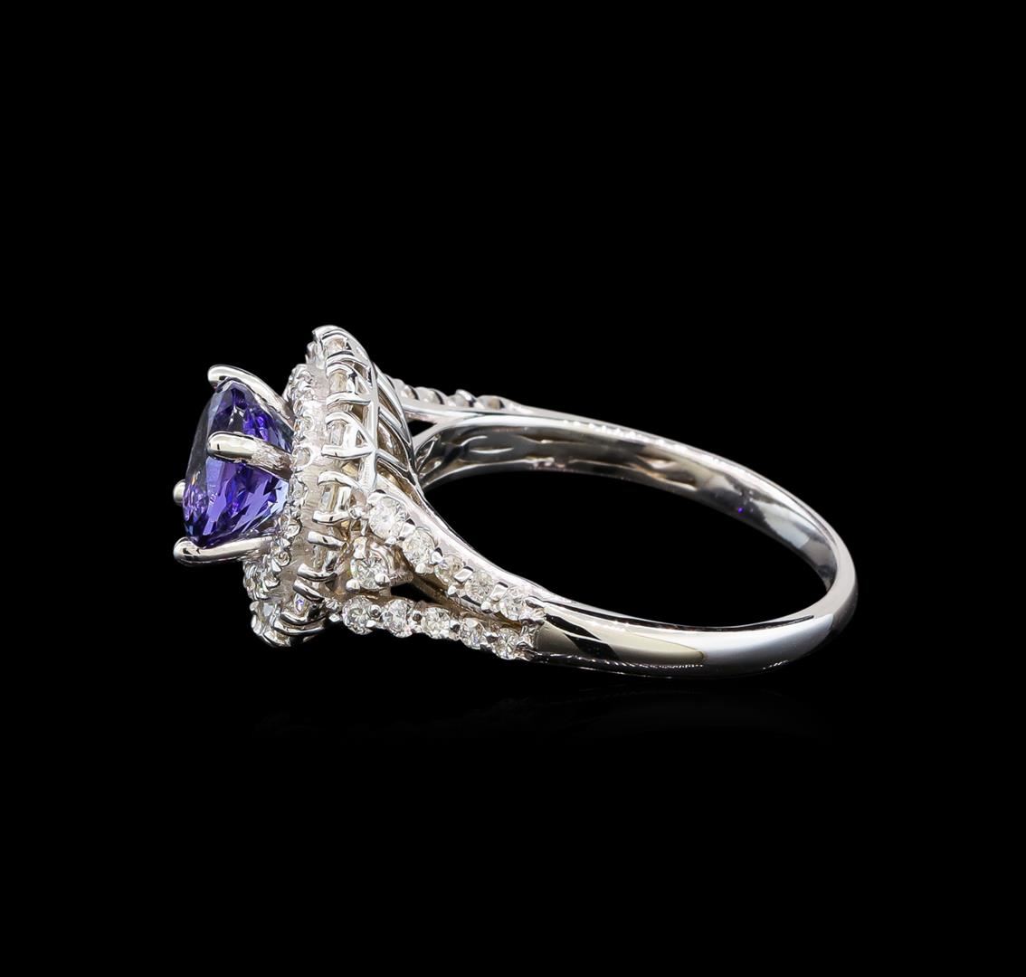 One electronically tested 14KT white gold ladies cast tanzanite and diamond ring with a bright polish finish. Identified with markings of "14K". Condition is new. Containing: One prong set round modified brilliant cut natural tanzanite, measuring 7.00 - 6.90 x 5.80 mm, approximate weight of 1.90ct., clarity is eye clean, type I, medium light, very slightly grayish, violet color, (GIA V 4/3), cut is good. Fifty-Seven prong set round brilliant cut diamonds, measuring 2.00 - 1.30 x 0.99mm (depth est.) approximate total weight of 57 Stones = 0.70ct. Clarity: SI-1 to SI-2. Color: I - J, Cut is Good. Colored gemstones are presumed to have been subjected to commonly used enhancement processes. All diamonds and colored gemstones are graded in the mounting, unless otherwise stated. Total Weight of Colored Stones 1.90ct. Total Weight of Diamonds 0.70ct. Total Weight of Ring 4.30 grams. GGL Appraised at $3,420.00.