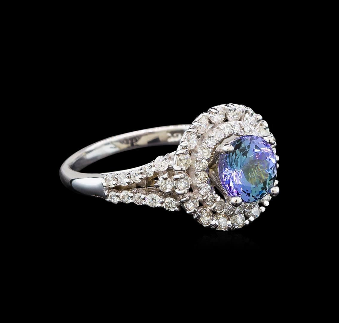 One electronically tested 14KT white gold ladies cast tanzanite and diamond ring with a bright polish finish. Identified with markings of "14K". Condition is new. Containing: One prong set round modified brilliant cut natural tanzanite, measuring 7.00 - 6.90 x 5.80 mm, approximate weight of 1.90ct., clarity is eye clean, type I, medium light, very slightly grayish, violet color, (GIA V 4/3), cut is good. Fifty-Seven prong set round brilliant cut diamonds, measuring 2.00 - 1.30 x 0.99mm (depth est.) approximate total weight of 57 Stones = 0.70ct. Clarity: SI-1 to SI-2. Color: I - J, Cut is Good. Colored gemstones are presumed to have been subjected to commonly used enhancement processes. All diamonds and colored gemstones are graded in the mounting, unless otherwise stated. Total Weight of Colored Stones 1.90ct. Total Weight of Diamonds 0.70ct. Total Weight of Ring 4.30 grams. GGL Appraised at $3,420.00.