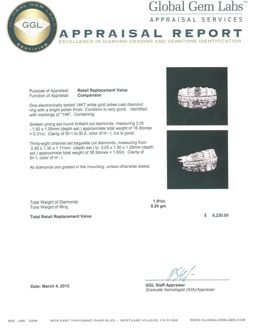 One electronically tested 14KT white gold ladies cast diamond ring with a bright polish finish. Identified with markings of "14K". Condition is very good. Containing: Sixteen prong set round brilliant cut diamonds, measuring 2.00. - 1.50 x 1.05mm (depth est.) approximate total weight of 16 Stones = 0.31ct. Clarity: SI-1 to SI-2. Color: H - I, Cut is Good. Thirty-Eight channel set baguette cut diamonds, measuring from 2.50 x 1.30 x 1.11mm (depth est.) to 3.00. x 1.50 x 1.28mm (depth est.) approximate total weight of 38 Stones = 1.60ct. Clarity: SI-1. Color: H - I. All diamonds are graded in the mounting, unless otherwise stated. Total Weight of Diamonds 1.91ct. Total Weight of Ring 8.20 grams. GGL Appraised at $6,230.00.