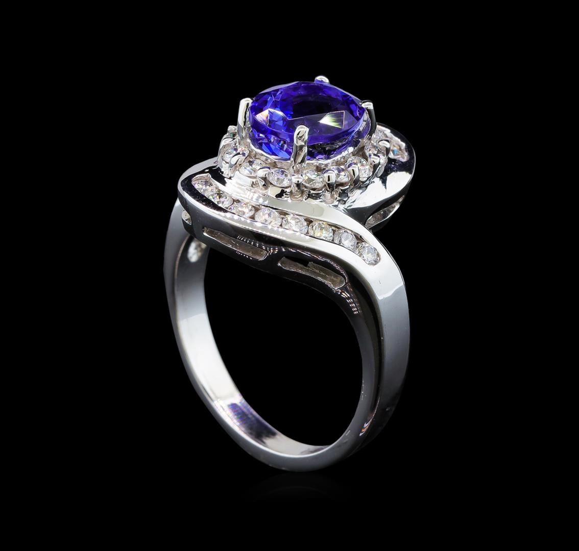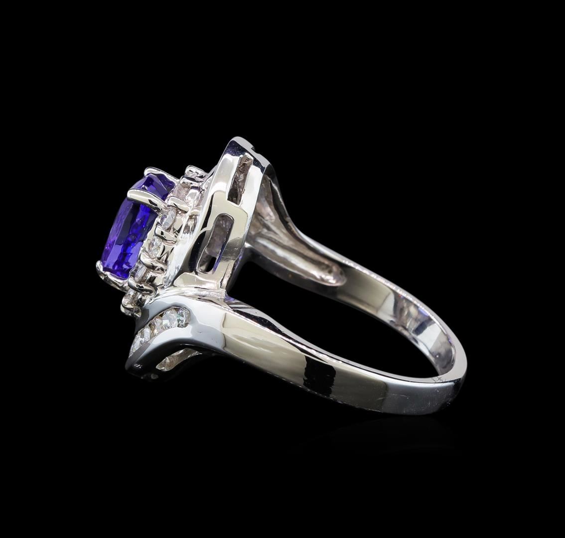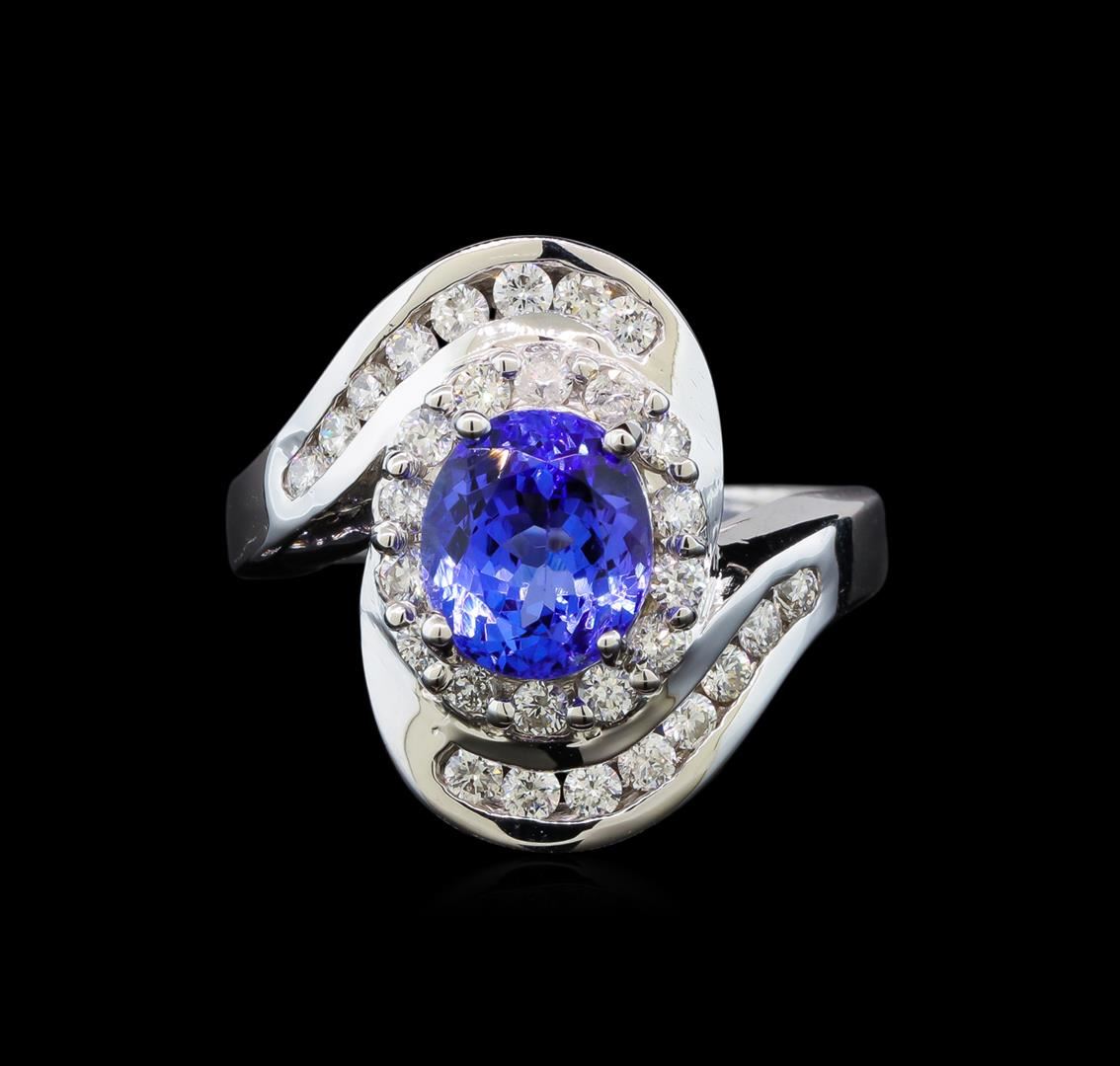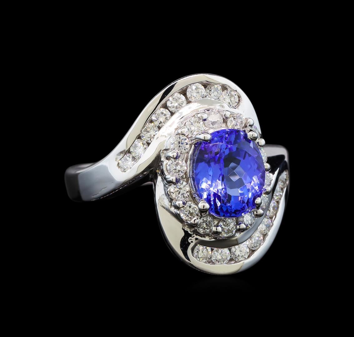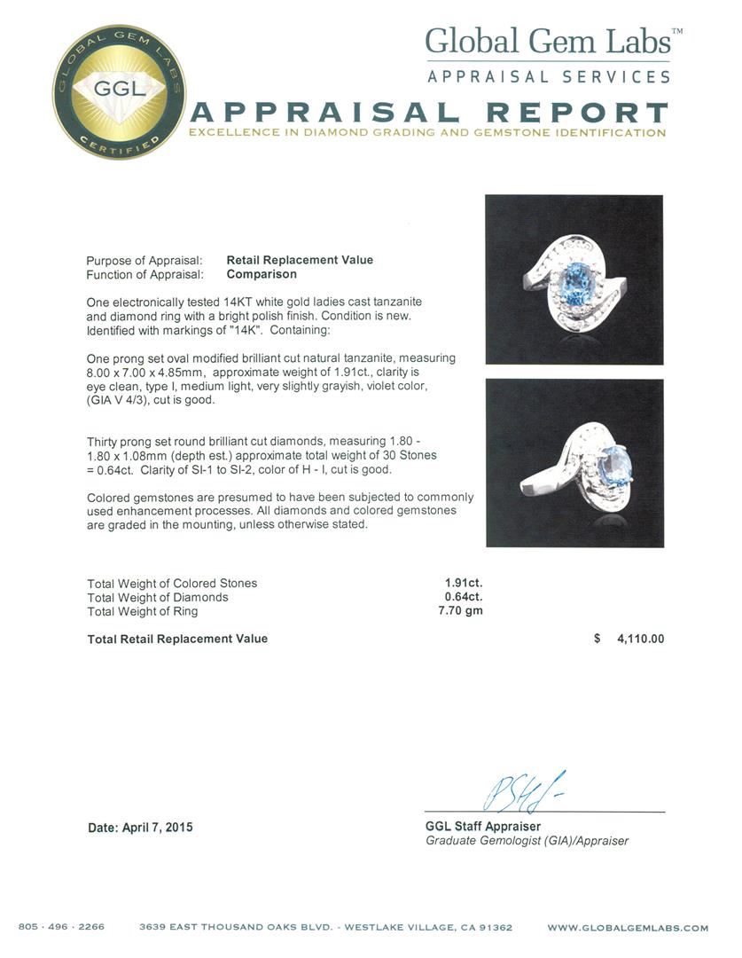 One electronically tested 14KT white gold ladies cast tanzanite and diamond ring with a bright polish finish. Identified with markings of "14K". Condition is new. Containing: One prong set oval modified brilliant cut natural tanzanite, measuring 8.00. x 7.00. x 4.85mm, approximate weight of 1.91ct., clarity is eye clean, type I, medium light, very slightly grayish, violet color, (GIA V 4/3), cut is good. Thirty prong set round brilliant cut diamonds, measuring 1.80 - 1.80 x 1.08mm (depth est.) approximate total weight of 30 Stones = 0.64ct. Clarity: SI-1 to SI-2. Color: H - I, Cut is Good. Colored gemstones are presumed to have been subjected to commonly used enhancement processes. All diamonds and colored gemstones are graded in the mounting, unless otherwise stated. Total Weight of Colored Stones 1.91ct. Total Weight of Diamonds 0.64ct. Total Weight of Ring 7.70 grams. GGL Appraised at $4,110.00.