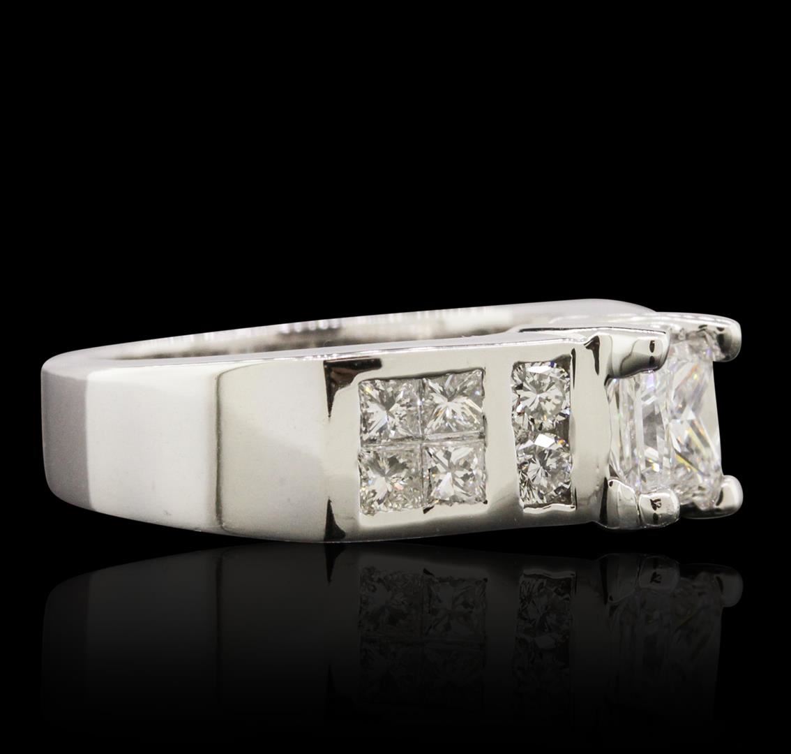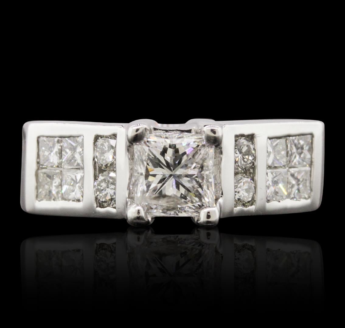 One electronically tested 14KT white gold ladies combination cast & assembled engagement ring with a bright polish finish. Condition is very good. Identified with markings of "14K". Containing: One prong set princess cut diamond, measuring 5.90 x 5.30 x 4.15mm (depth est.) approximate weight of 1.06ct. Clarity: I-1. Color: I, Cut is Good. Four channel set round brilliant cut diamonds, measuring 2.30 - 2.30 x 1.38mm (depth est.) approximate. Total Weight of 4 Stones = 0.18ct. Clarity: SI-1. Color: J, Cut is Good. Eight invisible set princess cut diamonds, measuring 2.40 x 2.40 x 1.80mm (depth est.) approximate. Total Weight of 8 Stones = 0.68ct. Clarity: SI-1. Color: I - J, Cut is Good. All diamonds are graded in the mounting, unless otherwise stated. Total Weight of Diamonds 1.92ct. Total Weight of Ring 9.50 grams. GGL Appraised at $16,465.00.