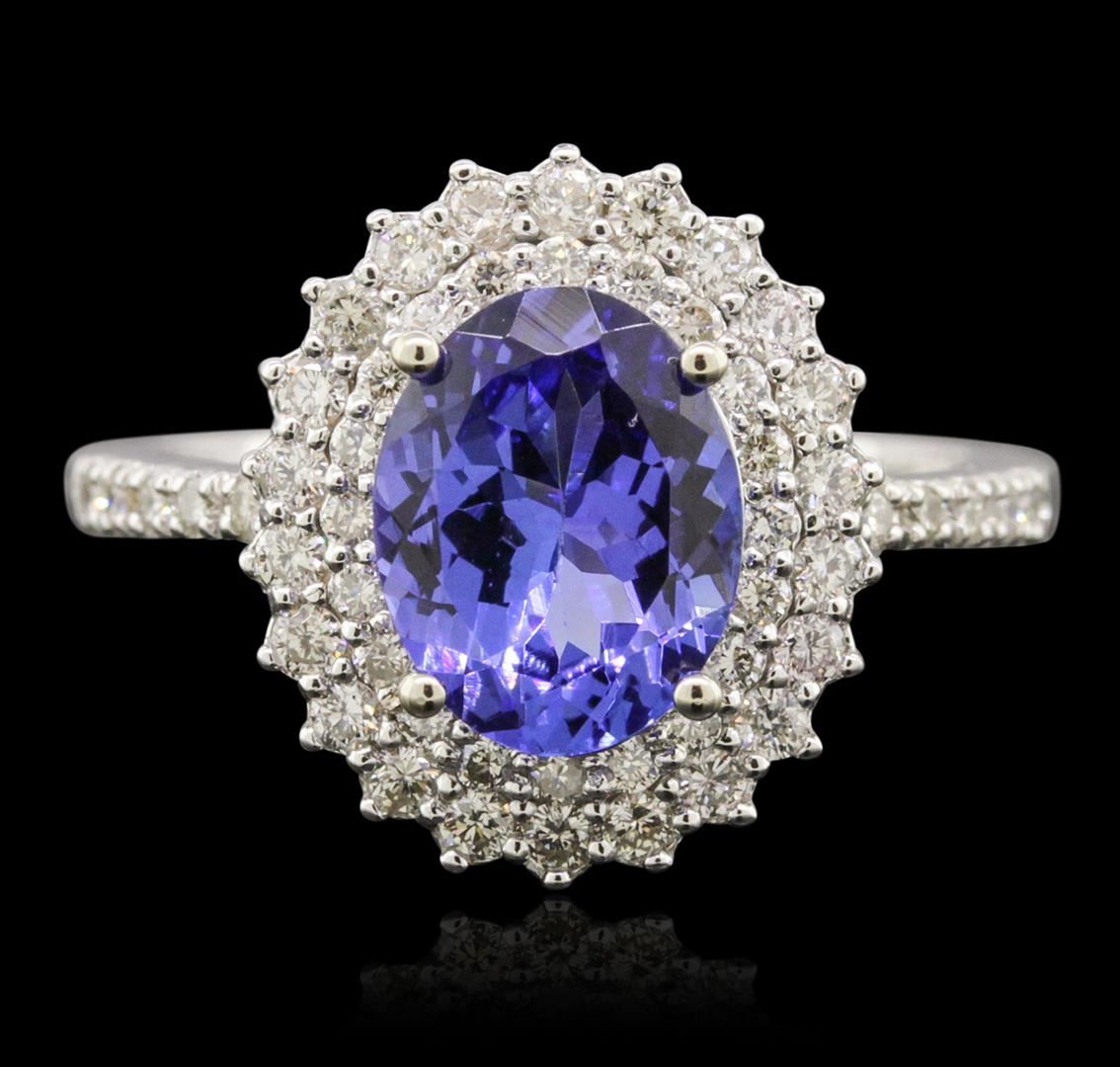 One electronically tested 14KT white gold ladies cast tanzanite and diamond ring with a bright polish finish. Condition is new, good workmanship. The featured tanzanite is set within a two tiered diamond bezel supported by diamond set shoulders, completed by a two millimeter wide band. Identified with markings of "585". Containing: One prong set oval brilliant cut natural tanzanite, measuring 9.35 x 7.10 x 4.00mm, 6%. bulge factor, approximate weight of 1.92ct., clarity is eye clean, type I, medium dark, very slightly grayish, violetish blue color, (GIA vB 6/3), cut is good. Transmitting light with no distortion, transparent. Graded in the setting. Tanzanite is a very rare gemstone that is only found in the country of Tanzania. Originally discovered in 1967. Tiffany & Company, named the stone Tanzanite. It is found in the Usumburu Mountains that border the Umba Valley of northern Tanzania. Tanzanite occurs in gray, brown, violet, blue, reddish-purple, & green. The gem is interesting because of its exceptional pleochroism. Rotated in different directions a tanzanite will exhibit multiple changes of color. Tanzanite has a low tolerance to ultrasonic cleaning, and should not be cleaned using this method. Fifty-Two prong set round brilliant cut diamonds, measuring 1.50 - 1.20 x 0.81mm (depth est.) approximate. Total Weight of 52 Stones = 0.56ct. Graded in the setting. Clarity: VS-2 to SI-2. Color: H - J. Total Weight of Colored Stones 1.92ct. Total Weight of Diamonds 0.56ct. Total Weight of Ring 4.51 grams. AIG Appraised at $6,700.00.