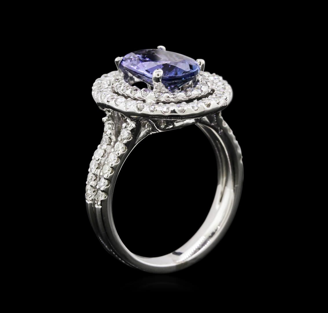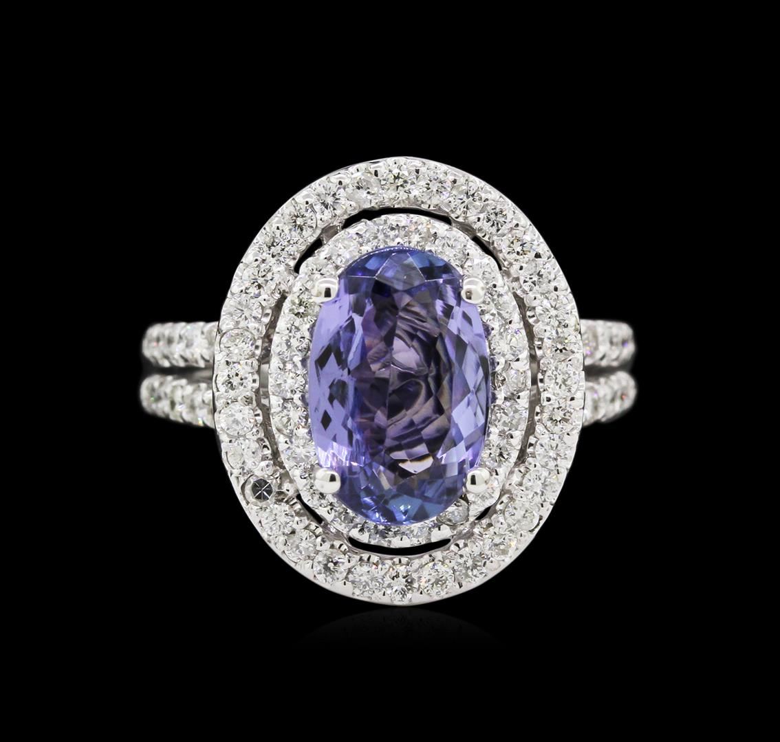 One electronically tested 14KT white gold ladies combination cast & assembled tanzanite and diamond ring with a bright polish finish. Identified with markings of "14K". Condition is new. Containing: One prong set oval modified brilliant cut natural tanzanite, measuring 11.00 x 7.20 x 3.45mm, approximate weight of 1.92ct., clarity is eye clean, type I, medium light, very slightly grayish, violet color, (GIA V 4/3), cut is good. Seventy-Nine prong set round brilliant cut diamonds, measuring 1.30 - 1.30 x 0.78mm (depth est.) approximate total weight of 79 Stones = 0.63ct. Clarity: SI-2 to I-1. Color: I - J, Cut is Good. Colored gemstones are presumed to have been subjected to commonly used enhancement processes. All diamonds and colored gemstones are graded in the mounting, unless otherwise stated. Total Weight of Colored Stones 1.92ct. Total Weight of Diamonds 0.63ct. Total Weight of Ring 7.00 grams. GGL Appraised at $4,920.00.
