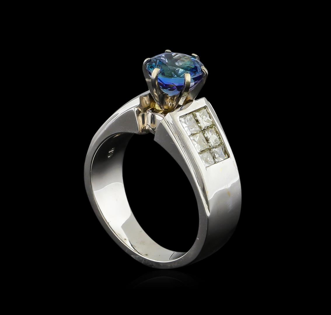 One electronically tested 14KT white gold ladies combination cast & assembled ring with a bright polish finish. Identified with markings of "14K". Condition is new. Containing: One prong set round modified brilliant cut natural tanzanite, measuring 7.38 - 7.32 x 5.26 mm, approximate weight of 1.92ct., clarity is eye clean, type I, medium light, very slightly grayish, violet color, (GIA V 4/3), cut is good. Twelve invisible set princess cut diamonds, measuring 2.50 x 2.30 x 1.73mm (depth est.) approximate total weight of 12 Stones = 0.98ct. Clarity: VS-2. Color: J - K, Cut is Good. Colored gemstones are presumed to have been subjected to commonly used enhancement processes. All diamonds and colored gemstones are graded in the mounting, unless otherwise stated. Total Weight of Colored Stones 1.92ct. Total Weight of Diamonds 0.98ct. Total Weight of Ring 11.20 grams. GGL Appraised at $8,765.00.