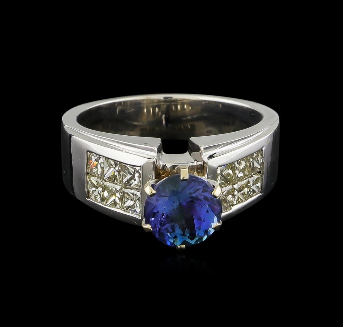 One electronically tested 14KT white gold ladies combination cast & assembled ring with a bright polish finish. Identified with markings of "14K". Condition is new. Containing: One prong set round modified brilliant cut natural tanzanite, measuring 7.38 - 7.32 x 5.26 mm, approximate weight of 1.92ct., clarity is eye clean, type I, medium light, very slightly grayish, violet color, (GIA V 4/3), cut is good. Twelve invisible set princess cut diamonds, measuring 2.50 x 2.30 x 1.73mm (depth est.) approximate total weight of 12 Stones = 0.98ct. Clarity: VS-2. Color: J - K, Cut is Good. Colored gemstones are presumed to have been subjected to commonly used enhancement processes. All diamonds and colored gemstones are graded in the mounting, unless otherwise stated. Total Weight of Colored Stones 1.92ct. Total Weight of Diamonds 0.98ct. Total Weight of Ring 11.20 grams. GGL Appraised at $8,765.00.