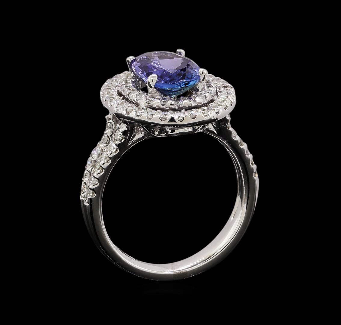 One electronically tested 14KT white gold ladies combination cast & assembled tanzanite and diamond ring with a bright polish finish. Identified with markings of "14K". Condition is new. Containing: One prong set oval modified brilliant cut natural tanzanite, measuring 11.00 x 7.20 x 3.45mm, approximate weight of 1.92ct., clarity is eye clean, type I, medium light, very slightly grayish, violet color, (GIA V 4/3), cut is good. Seventy-Nine prong set round brilliant cut diamonds, measuring 1.30 - 1.30 x 0.78mm (depth est.) approximate total weight of 79 Stones = 0.63ct. Clarity: SI-2 to I-1. Color: I - J, Cut is Good. Colored gemstones are presumed to have been subjected to commonly used enhancement processes. All diamonds and colored gemstones are graded in the mounting, unless otherwise stated. Total Weight of Colored Stones 1.92ct. Total Weight of Diamonds 0.63ct. Total Weight of Ring 7.00 grams. GGL Appraised at $4,920.00.