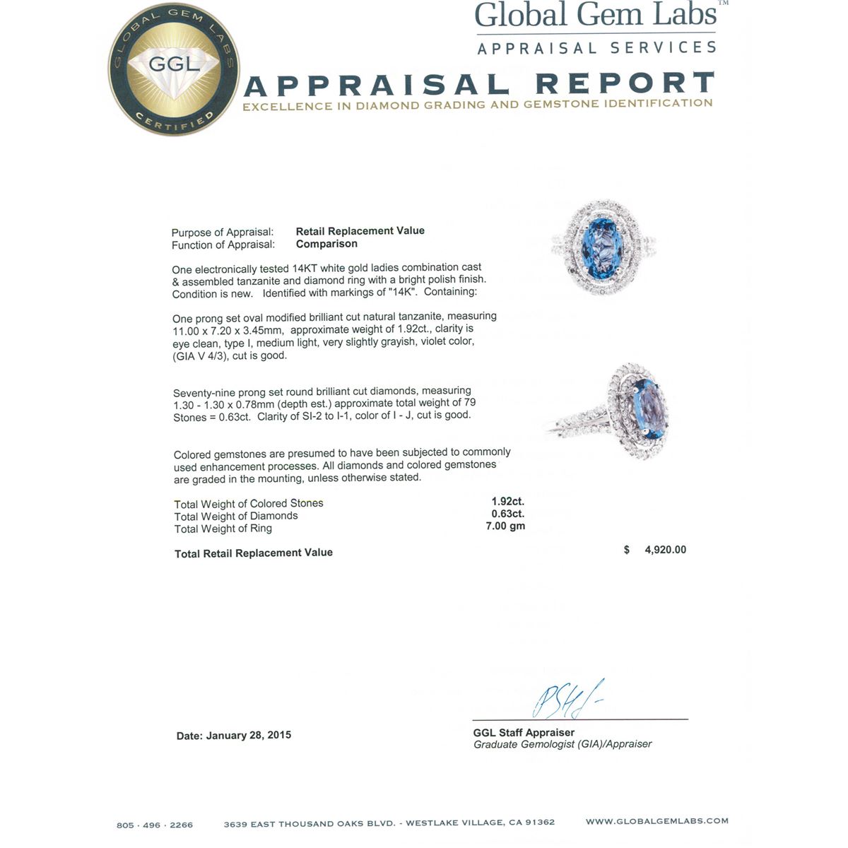 One electronically tested 14KT white gold ladies combination cast & assembled tanzanite and diamond ring with a bright polish finish. Identified with markings of "14K". Condition is new. Containing: One prong set oval modified brilliant cut natural tanzanite, measuring 11.00 x 7.20 x 3.45mm, approximate weight of 1.92ct., clarity is eye clean, type I, medium light, very slightly grayish, violet color, (GIA V 4/3), cut is good. Seventy-Nine prong set round brilliant cut diamonds, measuring 1.30 - 1.30 x 0.78mm (depth est.) approximate total weight of 79 Stones = 0.63ct. Clarity: SI-2 to I-1. Color: I - J, Cut is Good. Colored gemstones are presumed to have been subjected to commonly used enhancement processes. All diamonds and colored gemstones are graded in the mounting, unless otherwise stated. Total Weight of Colored Stones 1.92ct. Total Weight of Diamonds 0.63ct. Total Weight of Ring 7.00 grams. GGL Appraised at $4,920.00.
