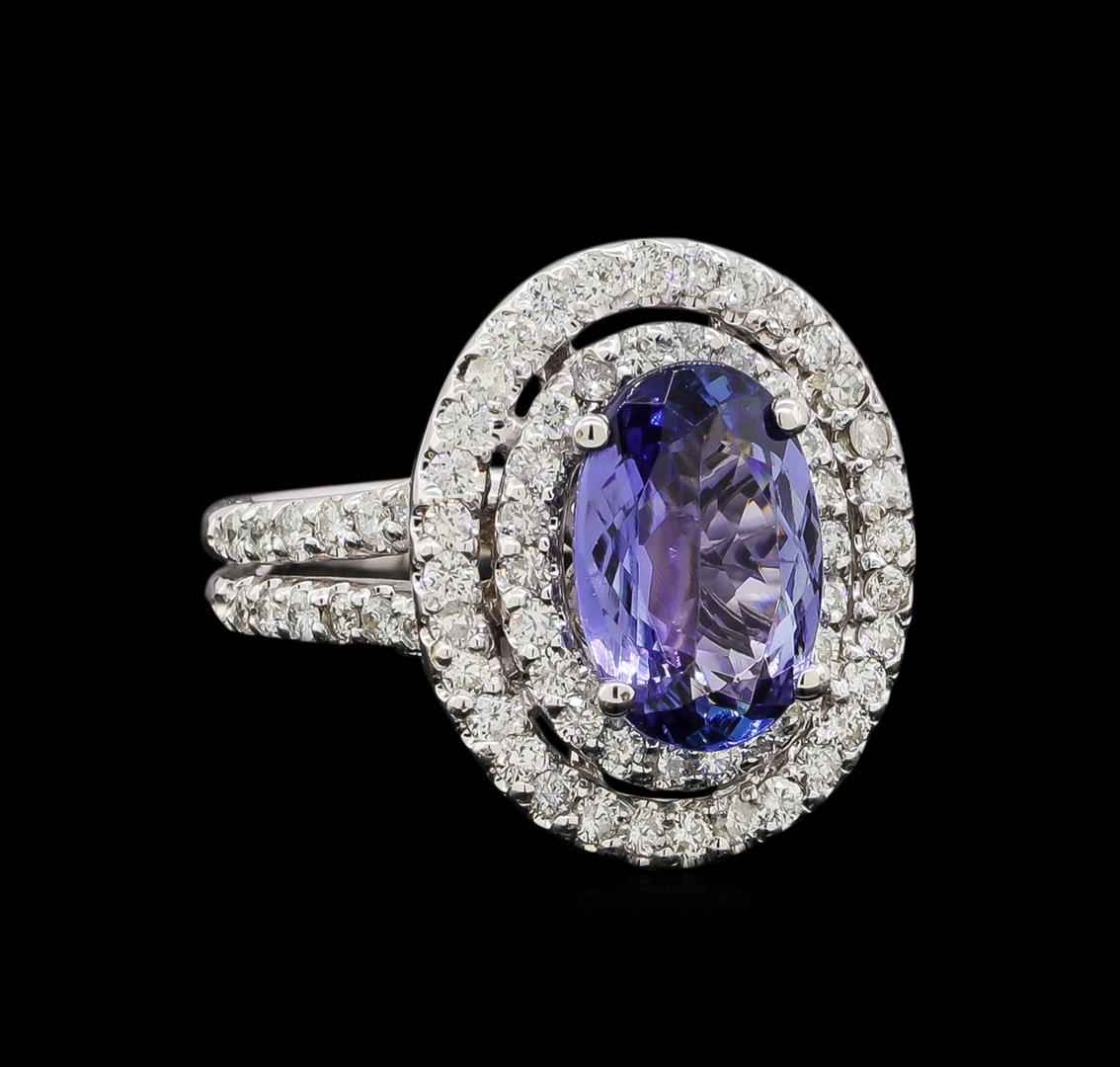 One electronically tested 14KT white gold ladies combination cast & assembled tanzanite and diamond ring with a bright polish finish. Identified with markings of "14K". Condition is new. Containing: One prong set oval modified brilliant cut natural tanzanite, measuring 11.00 x 7.20 x 3.45mm, approximate weight of 1.92ct., clarity is eye clean, type I, medium light, very slightly grayish, violet color, (GIA V 4/3), cut is good. Seventy-Nine prong set round brilliant cut diamonds, measuring 1.30 - 1.30 x 0.78mm (depth est.) approximate total weight of 79 Stones = 0.63ct. Clarity: SI-2 to I-1. Color: I - J, Cut is Good. Colored gemstones are presumed to have been subjected to commonly used enhancement processes. All diamonds and colored gemstones are graded in the mounting, unless otherwise stated. Total Weight of Colored Stones 1.92ct. Total Weight of Diamonds 0.63ct. Total Weight of Ring 7.00 grams. GGL Appraised at $4,920.00.