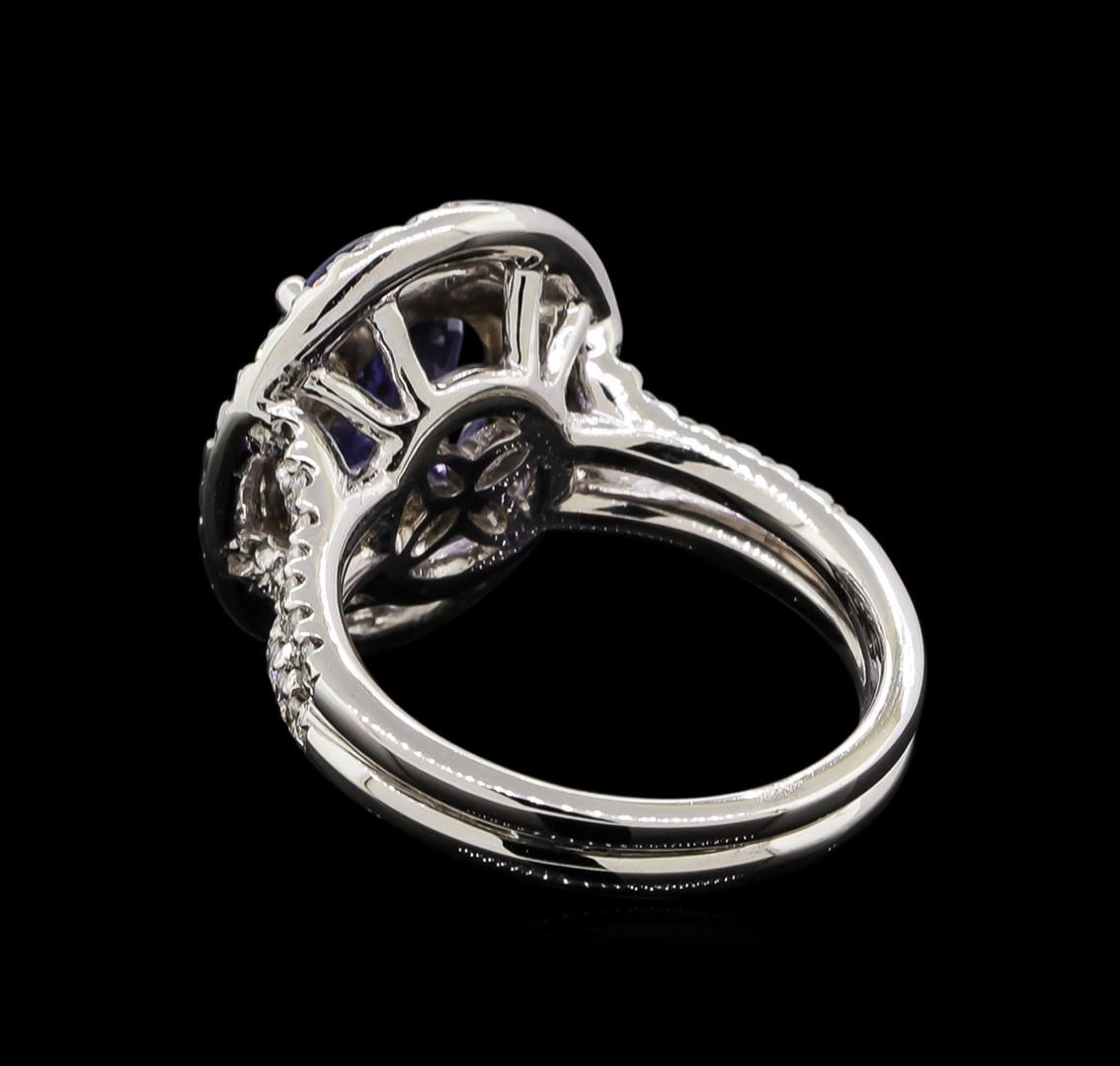 One electronically tested 14KT white gold ladies combination cast & assembled tanzanite and diamond ring with a bright polish finish. Identified with markings of "14K". Condition is new. Containing: One prong set oval modified brilliant cut natural tanzanite, measuring 11.00 x 7.20 x 3.45mm, approximate weight of 1.92ct., clarity is eye clean, type I, medium light, very slightly grayish, violet color, (GIA V 4/3), cut is good. Seventy-Nine prong set round brilliant cut diamonds, measuring 1.30 - 1.30 x 0.78mm (depth est.) approximate total weight of 79 Stones = 0.63ct. Clarity: SI-2 to I-1. Color: I - J, Cut is Good. Colored gemstones are presumed to have been subjected to commonly used enhancement processes. All diamonds and colored gemstones are graded in the mounting, unless otherwise stated. Total Weight of Colored Stones 1.92ct. Total Weight of Diamonds 0.63ct. Total Weight of Ring 7.00 grams. GGL Appraised at $4,920.00.