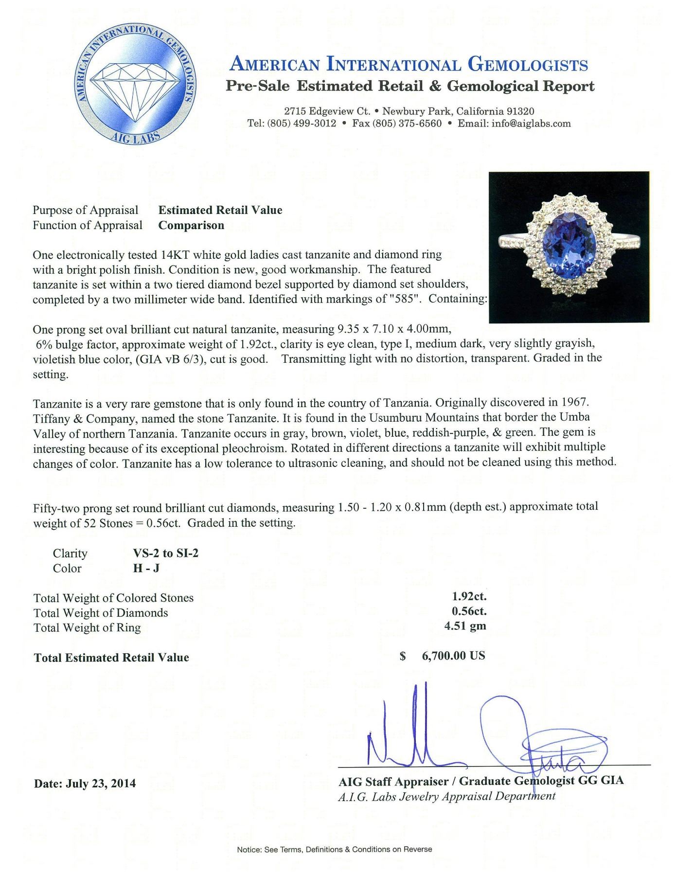 One electronically tested 14KT white gold ladies cast tanzanite and diamond ring with a bright polish finish. Condition is new, good workmanship. The featured tanzanite is set within a two tiered diamond bezel supported by diamond set shoulders, completed by a two millimeter wide band. Identified with markings of "585". Containing: One prong set oval brilliant cut natural tanzanite, measuring 9.35 x 7.10 x 4.00mm, 6%. bulge factor, approximate weight of 1.92ct., clarity is eye clean, type I, medium dark, very slightly grayish, violetish blue color, (GIA vB 6/3), cut is good. Transmitting light with no distortion, transparent. Graded in the setting. Tanzanite is a very rare gemstone that is only found in the country of Tanzania. Originally discovered in 1967. Tiffany & Company, named the stone Tanzanite. It is found in the Usumburu Mountains that border the Umba Valley of northern Tanzania. Tanzanite occurs in gray, brown, violet, blue, reddish-purple, & green. The gem is interesting because of its exceptional pleochroism. Rotated in different directions a tanzanite will exhibit multiple changes of color. Tanzanite has a low tolerance to ultrasonic cleaning, and should not be cleaned using this method. Fifty-Two prong set round brilliant cut diamonds, measuring 1.50 - 1.20 x 0.81mm (depth est.) approximate. Total Weight of 52 Stones = 0.56ct. Graded in the setting. Clarity: VS-2 to SI-2. Color: H - J. Total Weight of Colored Stones 1.92ct. Total Weight of Diamonds 0.56ct. Total Weight of Ring 4.51 grams. AIG Appraised.
