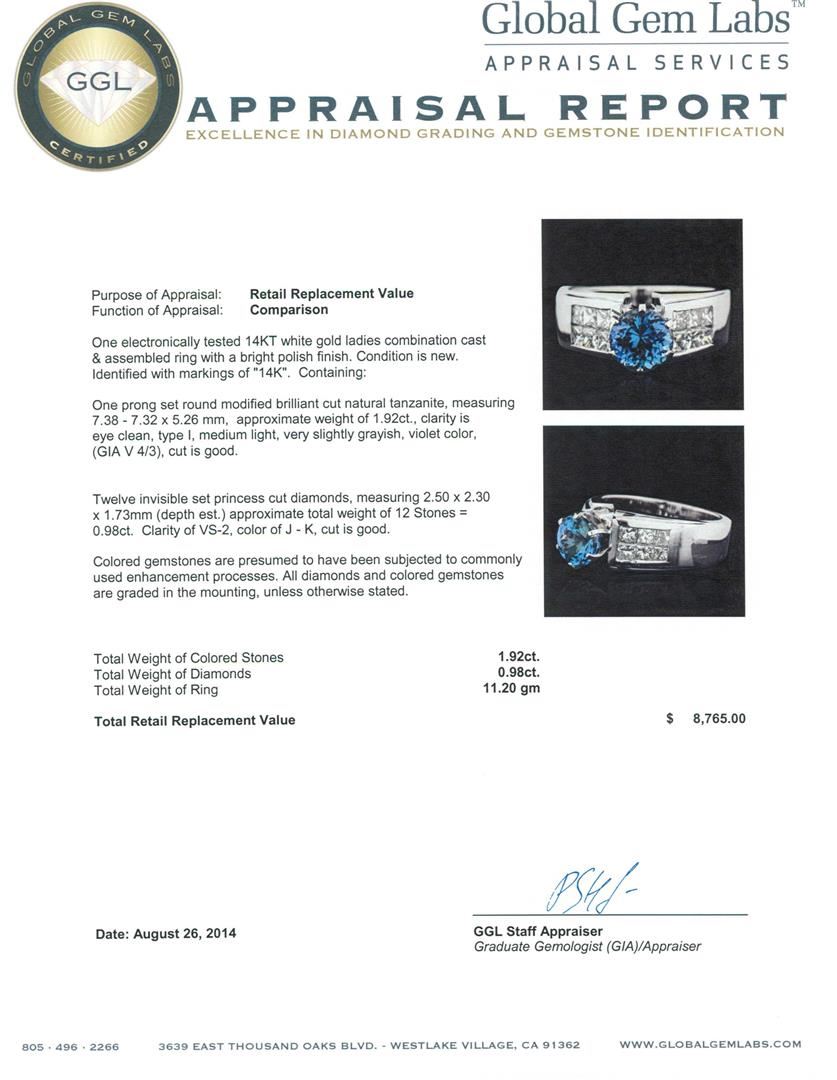 One electronically tested 14KT white gold ladies combination cast & assembled ring with a bright polish finish. Identified with markings of "14K". Condition is new. Containing: One prong set round modified brilliant cut natural tanzanite, measuring 7.38 - 7.32 x 5.26 mm, approximate weight of 1.92ct., clarity is eye clean, type I, medium light, very slightly grayish, violet color, (GIA V 4/3), cut is good. Twelve invisible set princess cut diamonds, measuring 2.50 x 2.30 x 1.73mm (depth est.) approximate total weight of 12 Stones = 0.98ct. Clarity: VS-2. Color: J - K, Cut is Good. Colored gemstones are presumed to have been subjected to commonly used enhancement processes. All diamonds and colored gemstones are graded in the mounting, unless otherwise stated. Total Weight of Colored Stones 1.92ct. Total Weight of Diamonds 0.98ct. Total Weight of Ring 11.20 grams. GGL Appraised.