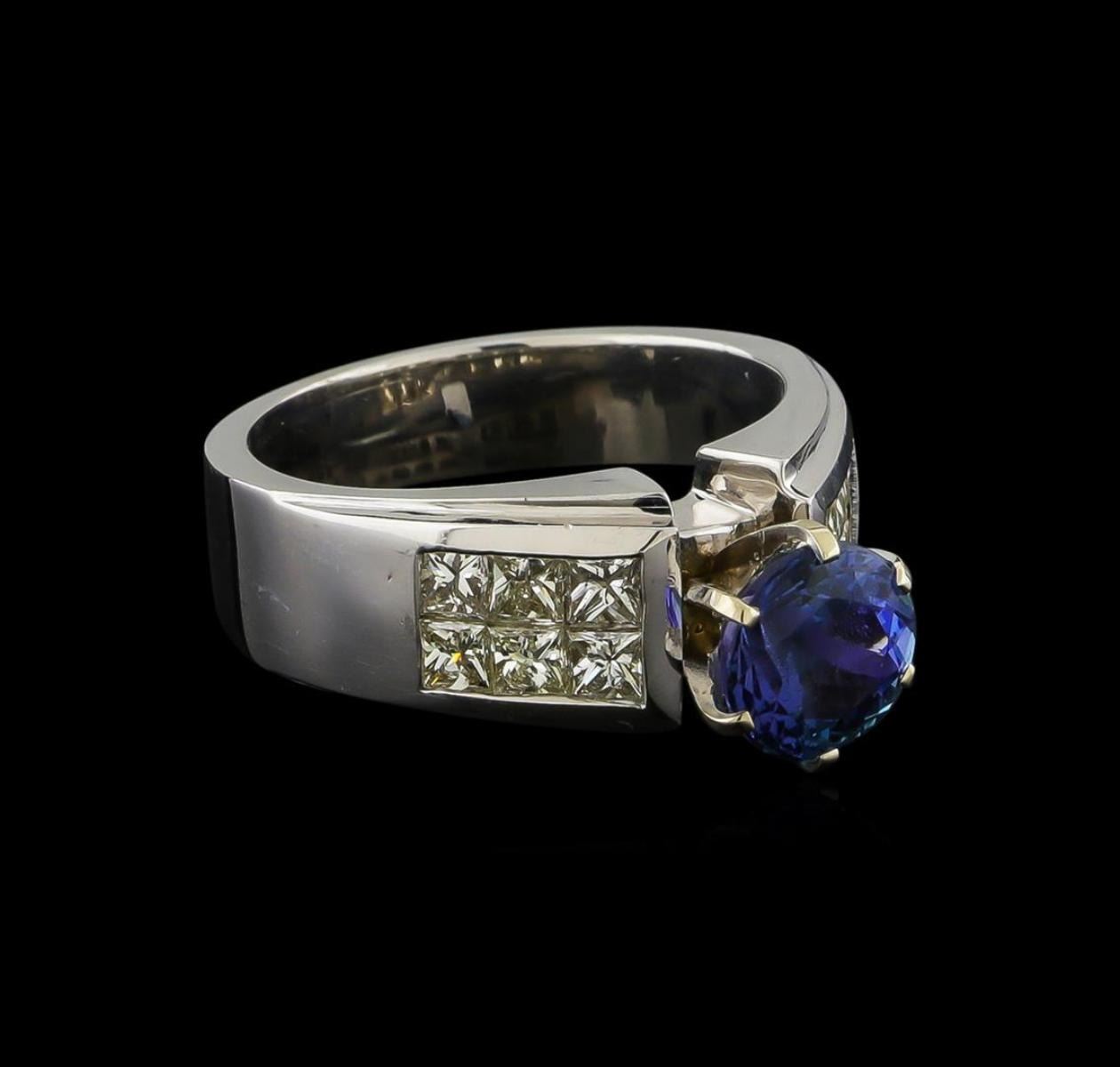 One electronically tested 14KT white gold ladies combination cast & assembled ring with a bright polish finish. Identified with markings of "14K". Condition is new. Containing: One prong set round modified brilliant cut natural tanzanite, measuring 7.38 - 7.32 x 5.26 mm, approximate weight of 1.92ct., clarity is eye clean, type I, medium light, very slightly grayish, violet color, (GIA V 4/3), cut is good. Twelve invisible set princess cut diamonds, measuring 2.50 x 2.30 x 1.73mm (depth est.) approximate total weight of 12 Stones = 0.98ct. Clarity: VS-2. Color: J - K, Cut is Good. Colored gemstones are presumed to have been subjected to commonly used enhancement processes. All diamonds and colored gemstones are graded in the mounting, unless otherwise stated. Total Weight of Colored Stones 1.92ct. Total Weight of Diamonds 0.98ct. Total Weight of Ring 11.20 grams. GGL Appraised.
