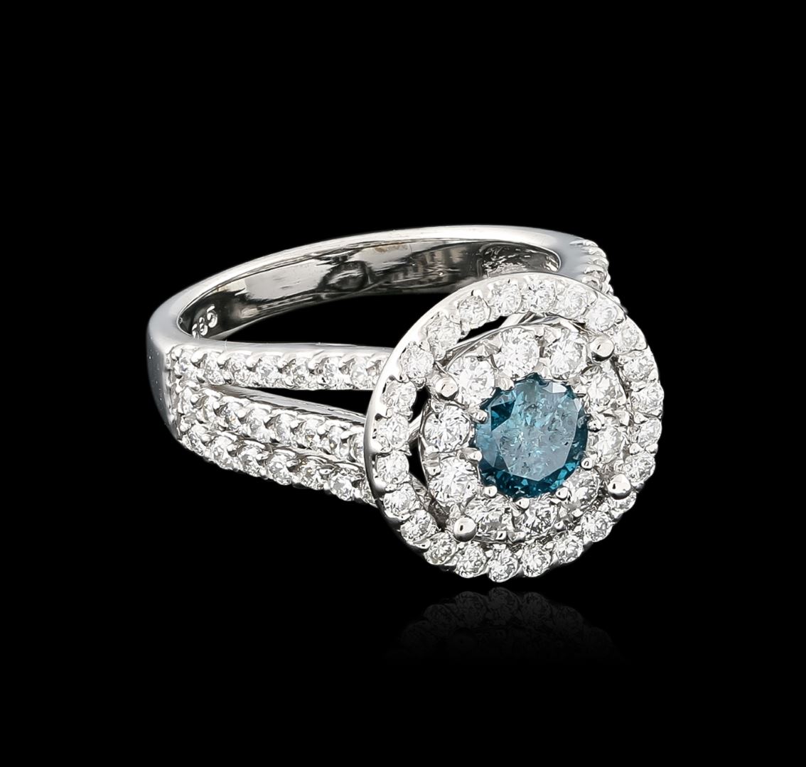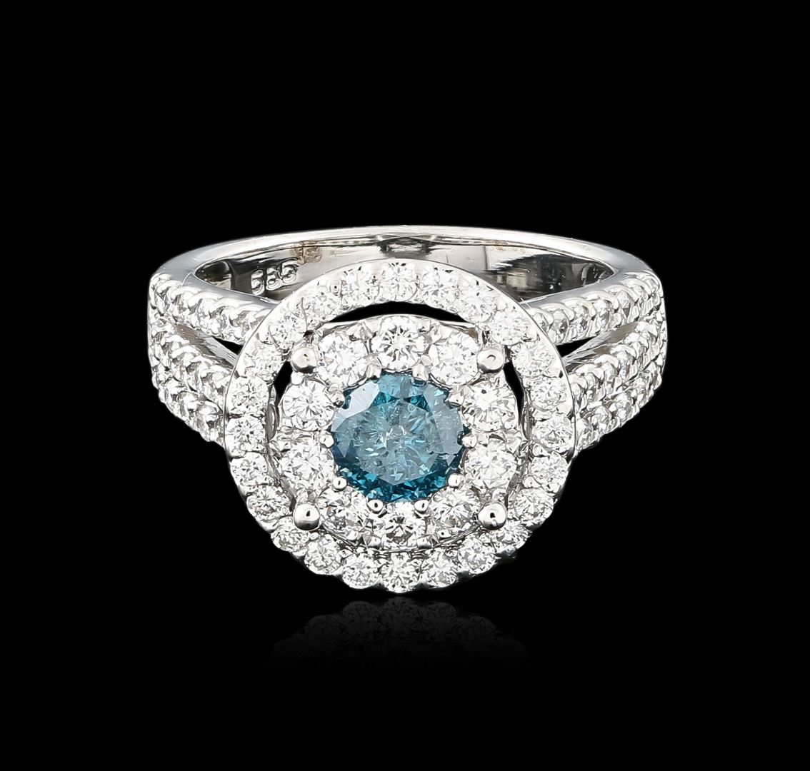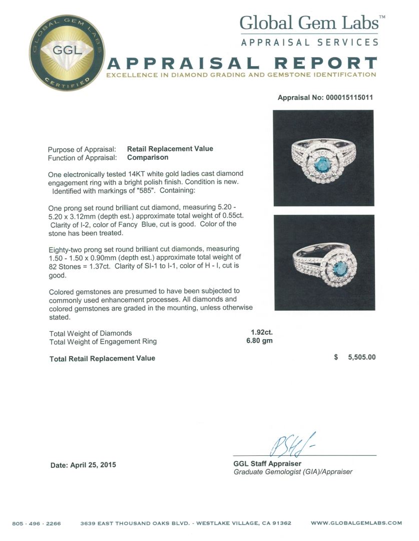 One electronically tested 14KT white gold ladies cast diamond engagement ring with a bright polish finish. Identified with markings of "585". Condition is new. Containing: One prong set round brilliant cut diamond, measuring 5.20 - 5.20 x 3.12mm (depth est.) approximate total weight of 0.55ct. Clarity: I-2, Cut is Good. Color of the stone has been treated. Eighty-Two prong set round brilliant cut diamonds, measuring 1.50 - 1.50 x 0.90mm (depth est.) approximate total weight of 82 Stones = 1.37ct. Clarity: SI-1 to I-1. Color: H - I, Cut is Good. Colored gemstones are presumed to have been subjected to commonly used enhancement processes. All diamonds and colored gemstones are graded in the mounting, unless otherwise stated. Total Weight of Diamonds 1.92ct. Total Weight of Engagement Ring 6.80 grams. GGL Appraised at $5,505.00.