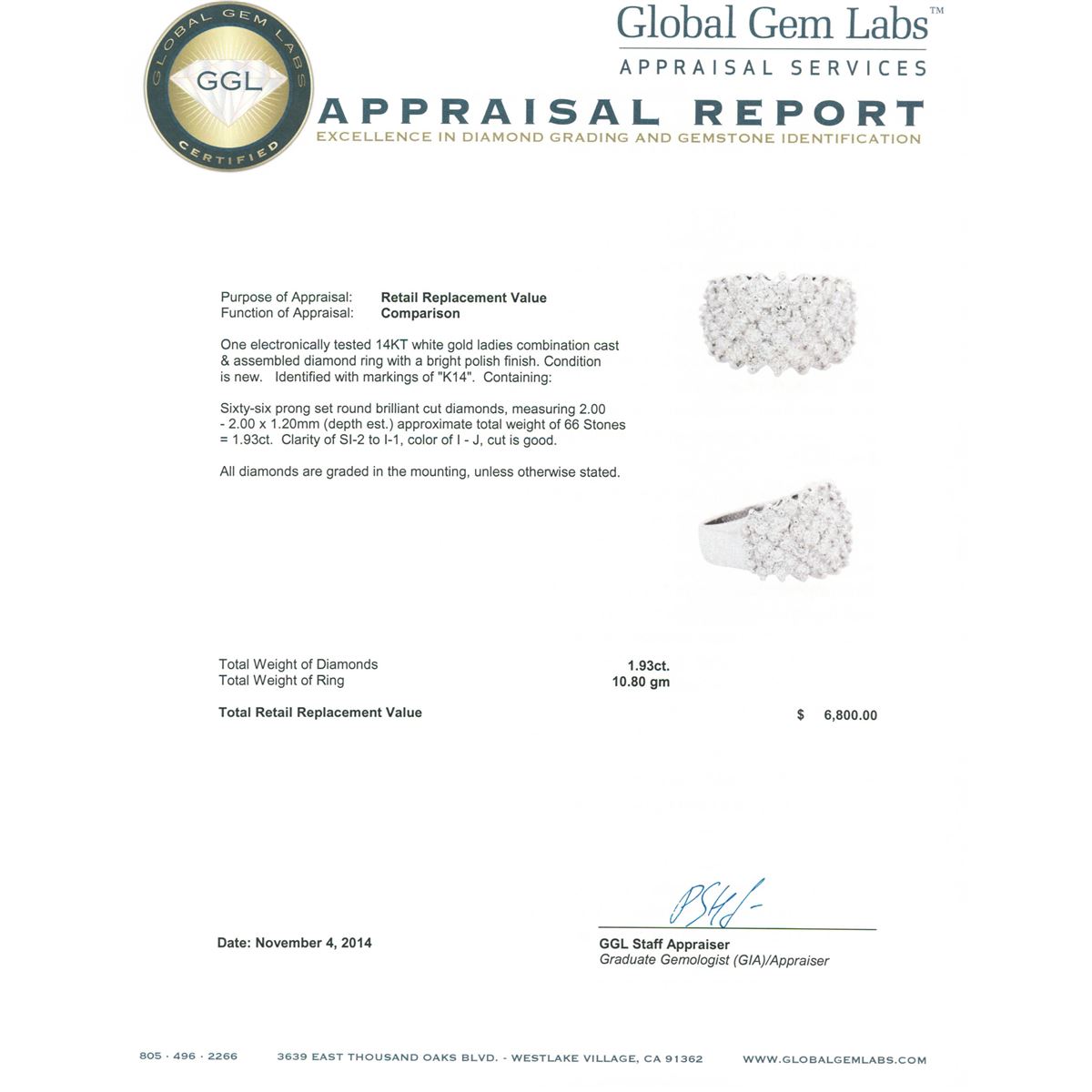 One electronically tested 14KT white gold ladies combination cast & assembled diamond ring with a bright polish finish. Identified with markings of "K14". Condition is new. Containing: Sixty-Six prong set round brilliant cut diamonds, measuring 2.00 - 2.00 x 1.20mm (depth est.) approximate total weight of 66 Stones = 1.93ct. Clarity: SI-2 to I-1. Color: I - J, Cut is Good. All diamonds are graded in the mounting, unless otherwise stated. Total Weight of Diamonds 1.93ct. Total Weight of Ring 10.80 grams. GGL Appraised at $6,800.00.